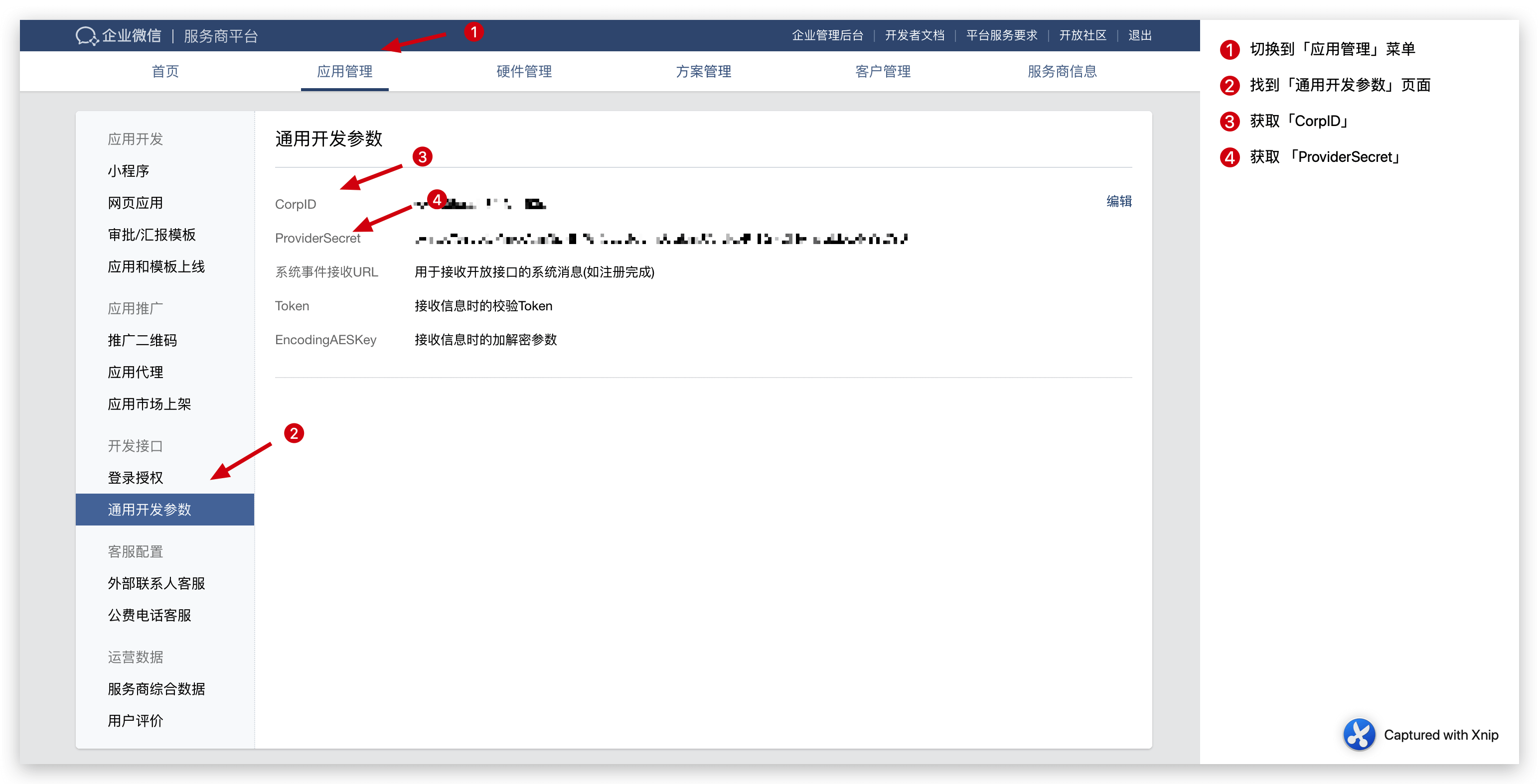 你需要提供 CorpID 和 ProviderSecret,可在 应用管理 - 通用开发参数 (opens new window)页面获取: