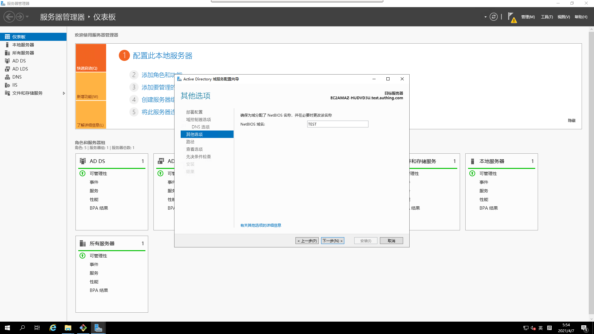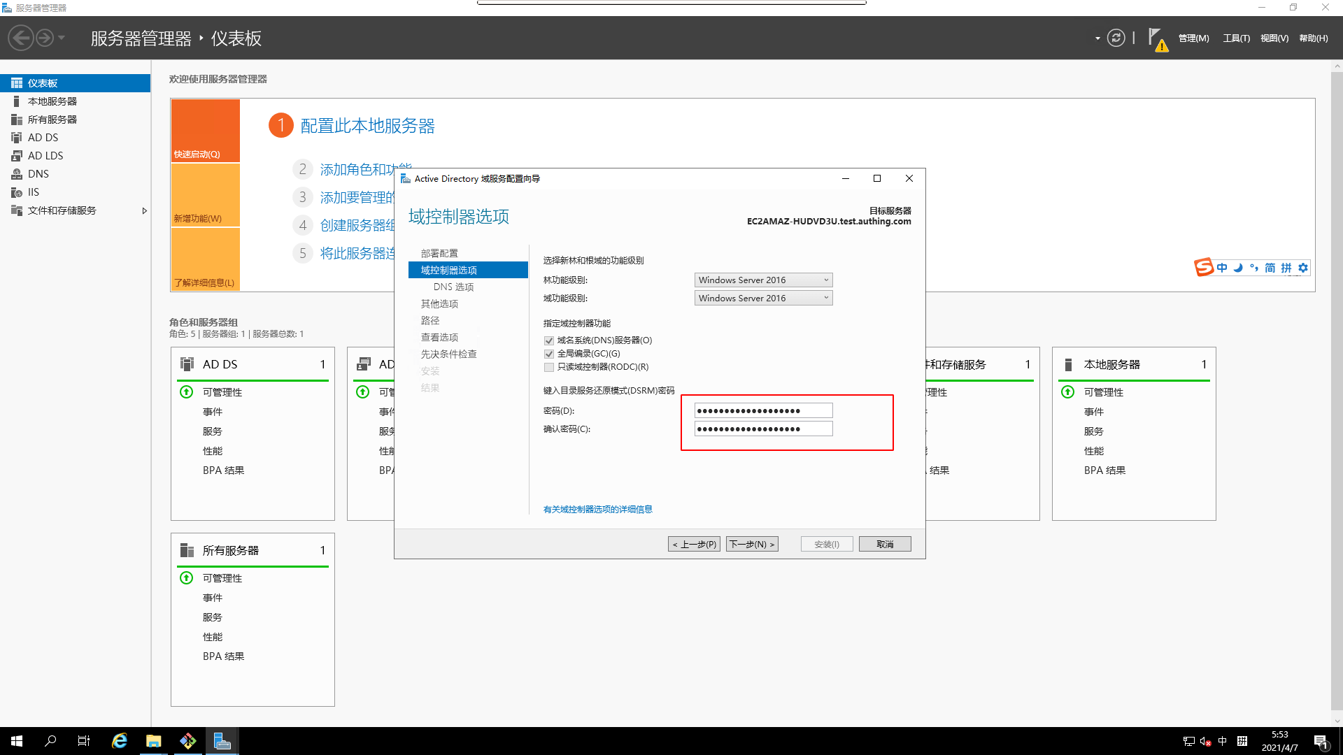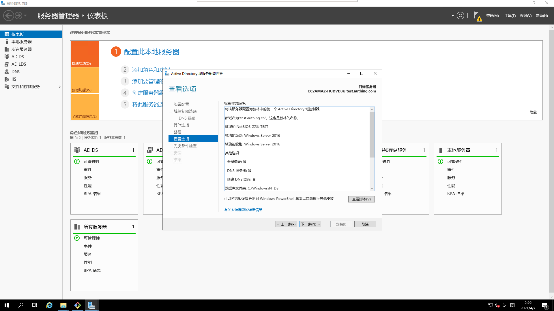 配置 AD 域服务的安装, 此处只是提供安装过程, 以及需要注意的点。
