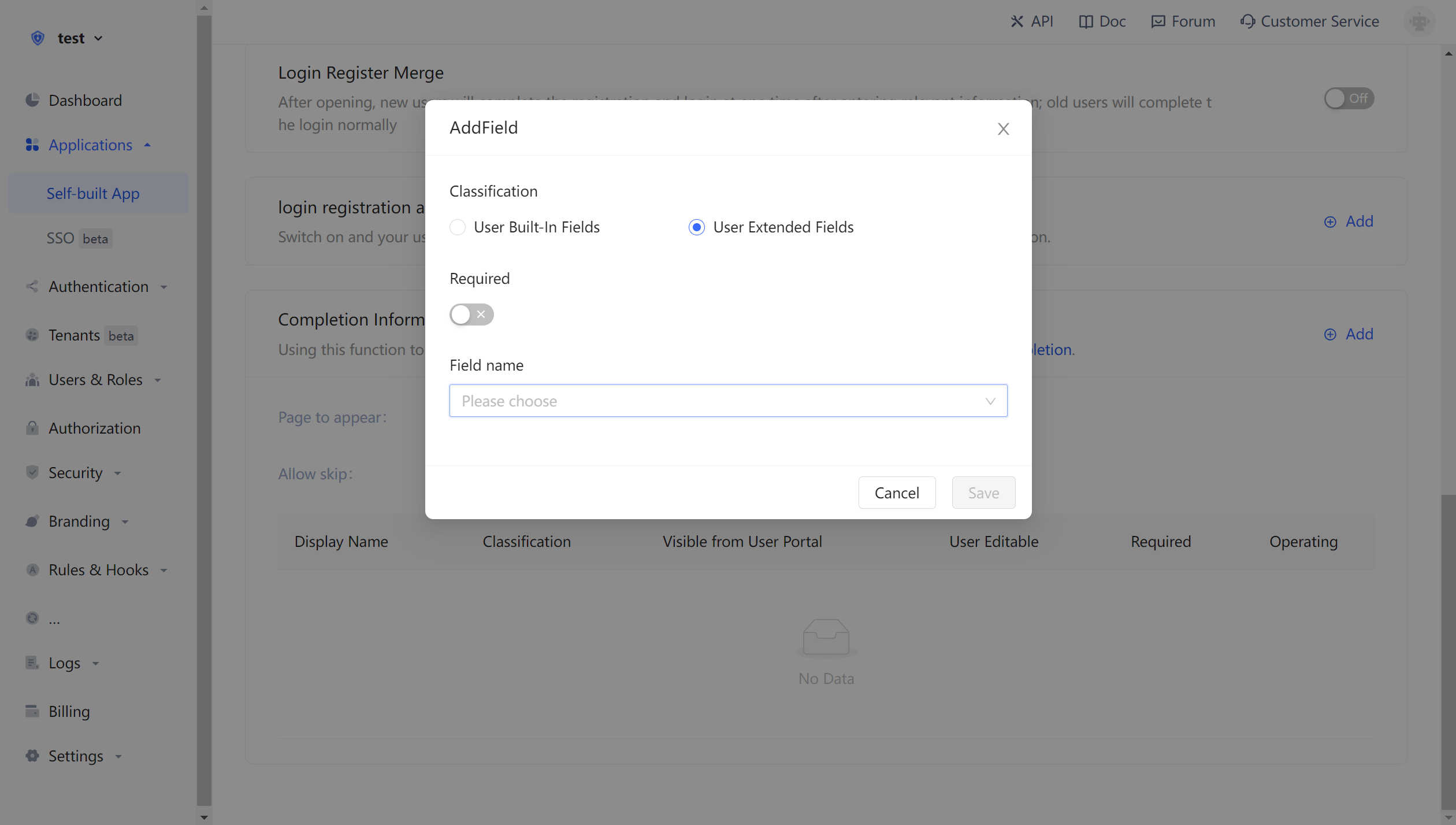 In the Application Details - Login and Registration Configuration page, click **Enable registration information completion ** switch, and then select the user defined field just added:
