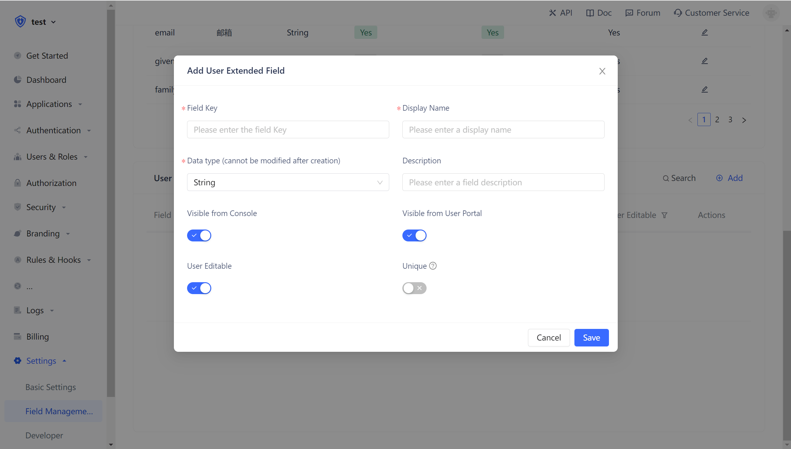 User defined fields are fields that can be added to user objects in addition to the basci user fields. Developers can store a small amount of business-related data by setting user defined fields. You can define the following types of user defined fields: