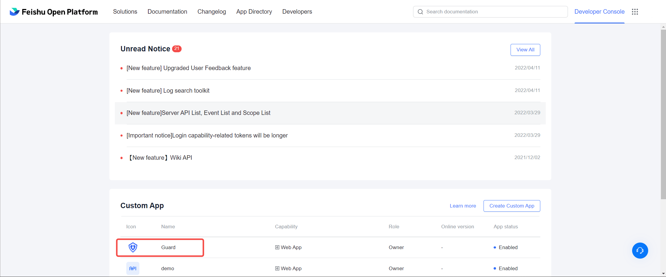 3.2 After submitting the application, your business administrator will review it and the review result will be sent to you via FeiBook and developer backend. For more details, please refer to Feishu Documentation - Developing Enterprise custom Applications (opens new window)