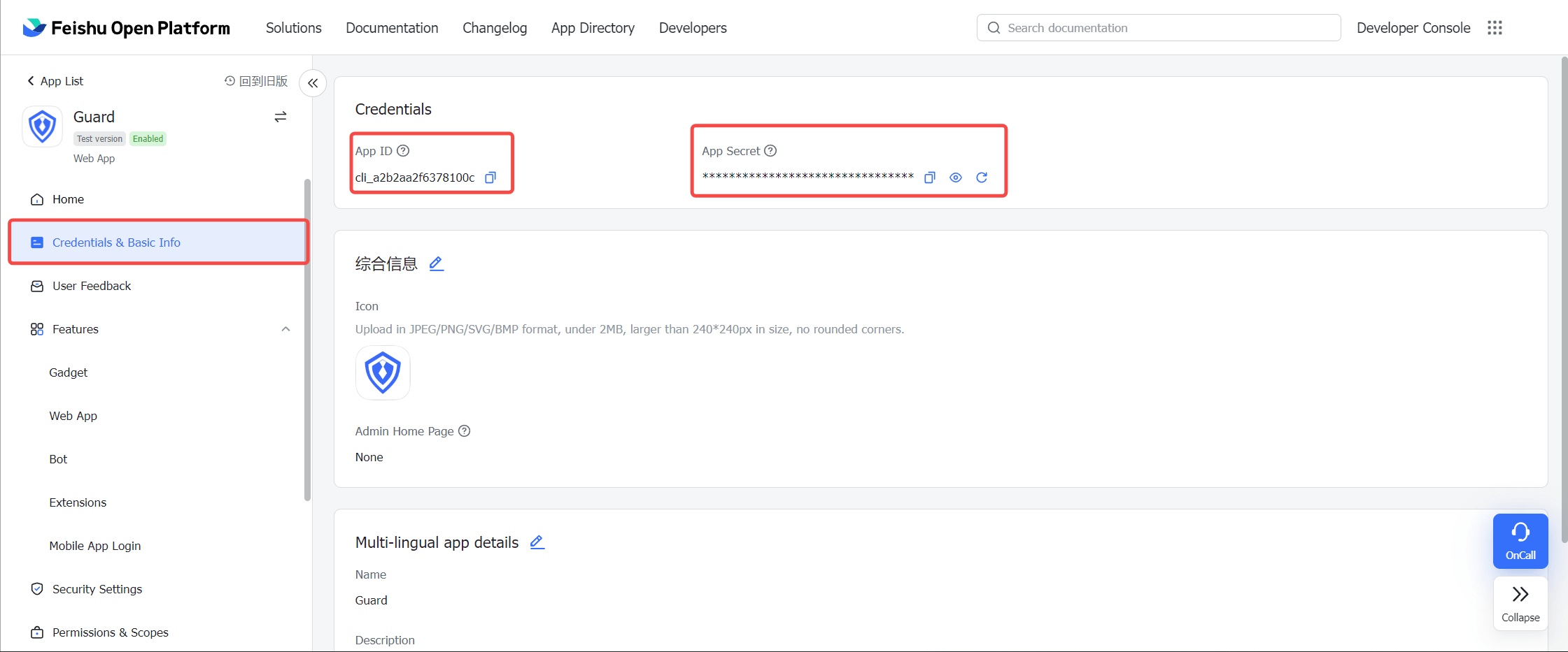 App ID and App Secret, fill in the App ID and App Secret in Credentials and Basic Info in the backend of Feishu app.