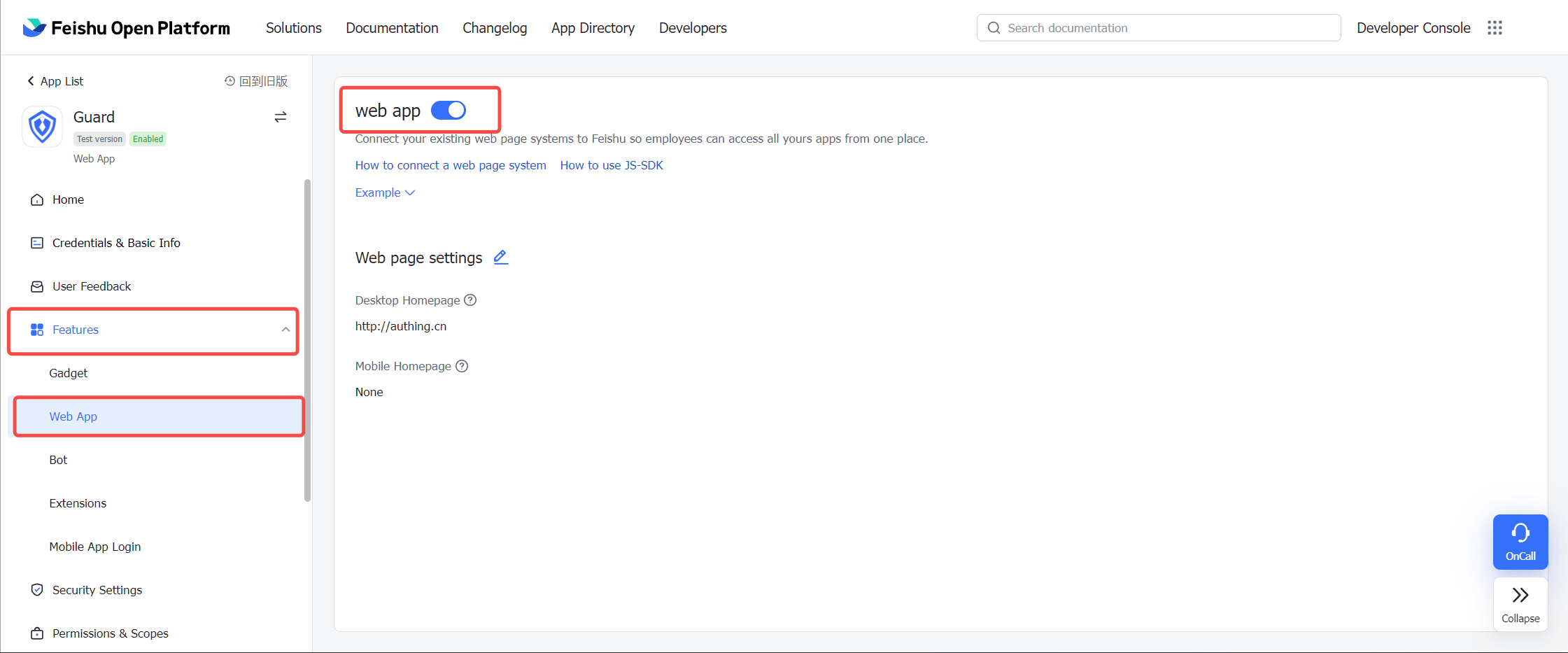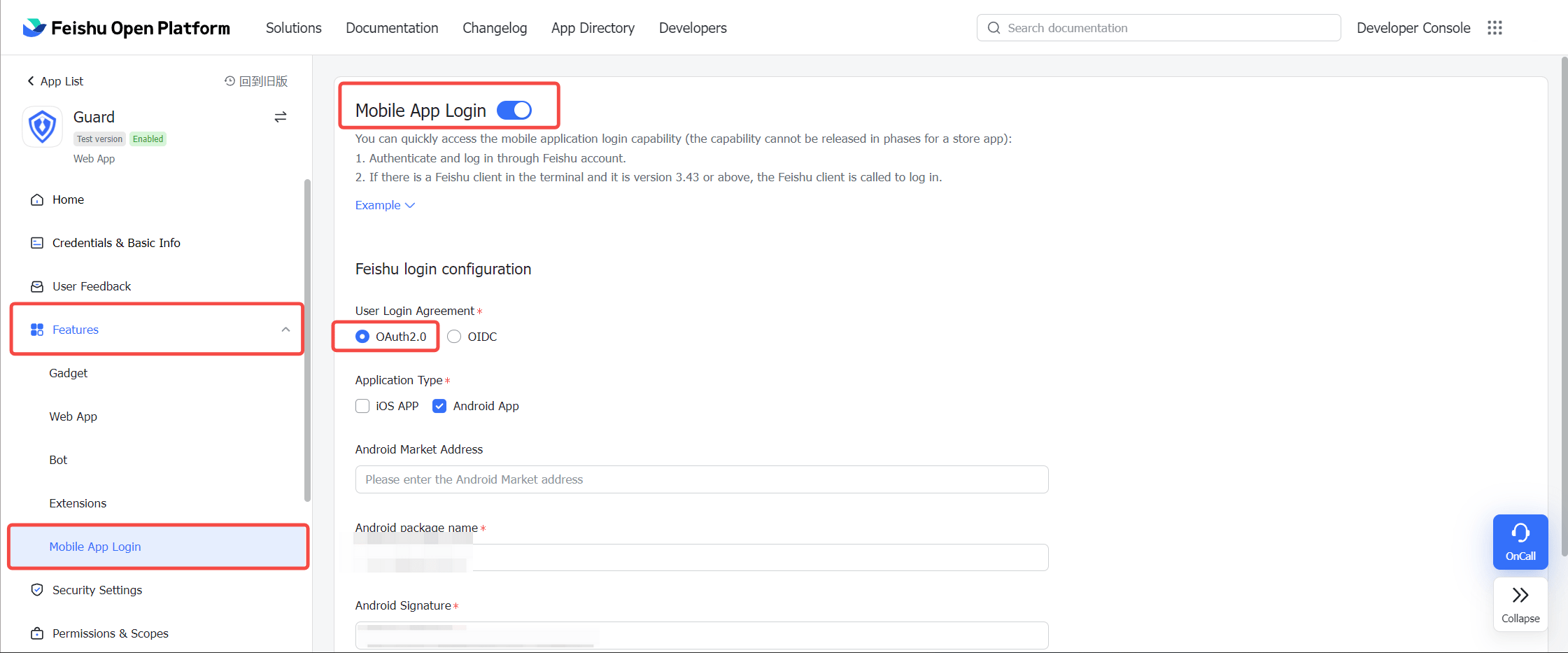 If you need Mobile App Login, click Features, select Mobile App Login, turn on the Feishu Login feature, and in the Feishu login configuration below, user login protocol option OAuth 2.0, and fill in the mobile app configuration.