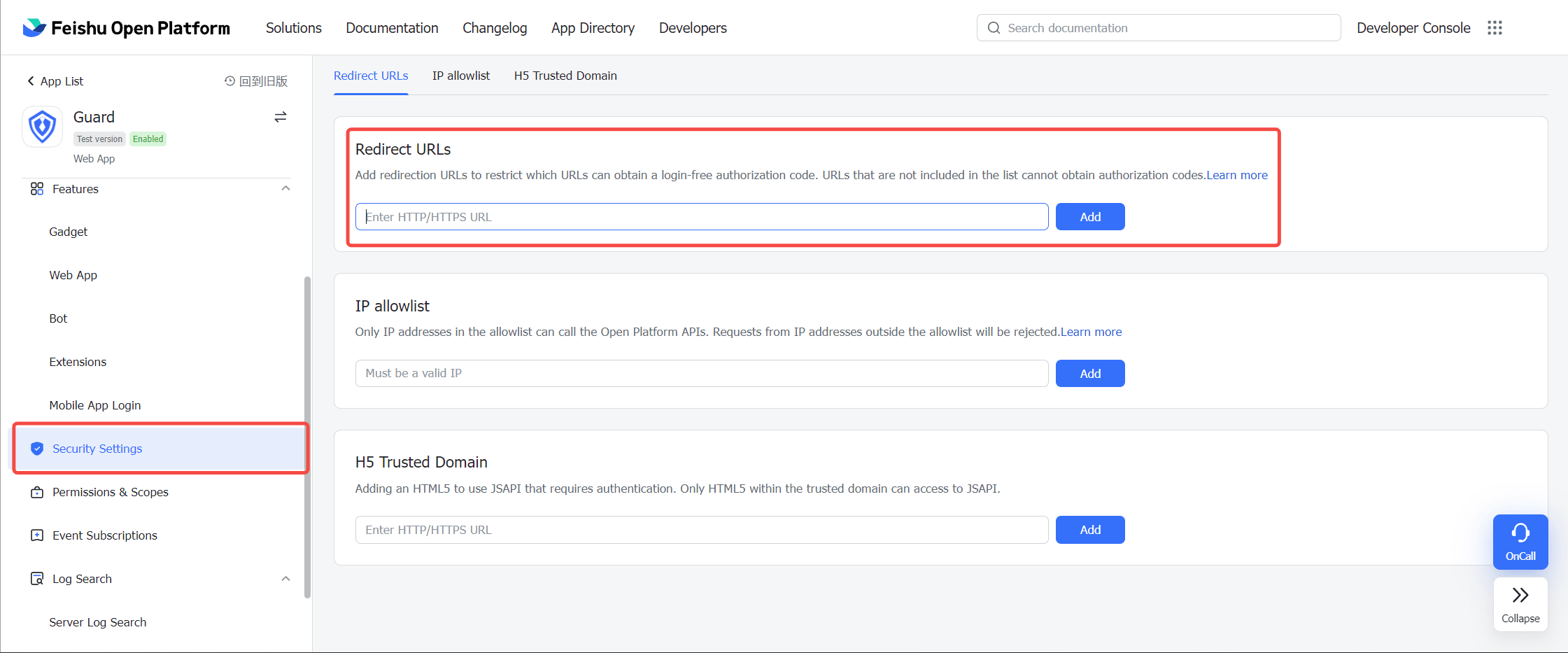 In the Feishu Open Platform, open the app management page, select Security Settings, add the Authing backend callback address to the Redirect URL