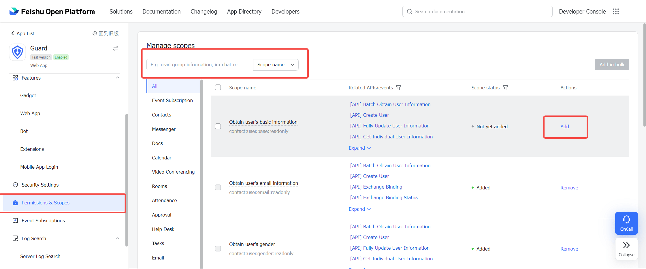 In order to normally obtain the user information of the feishu and complete the authentication process, you need to complete Permissions & Scopes page, search the following permissions, and open: