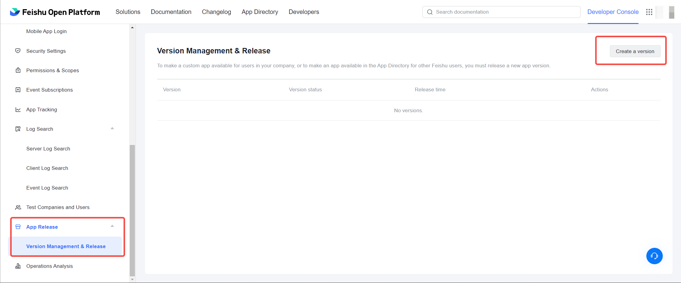 3.1 In the Feishu Open Platform, select app publishing, and in Version Management & Release, click Create a version, and publish the created app