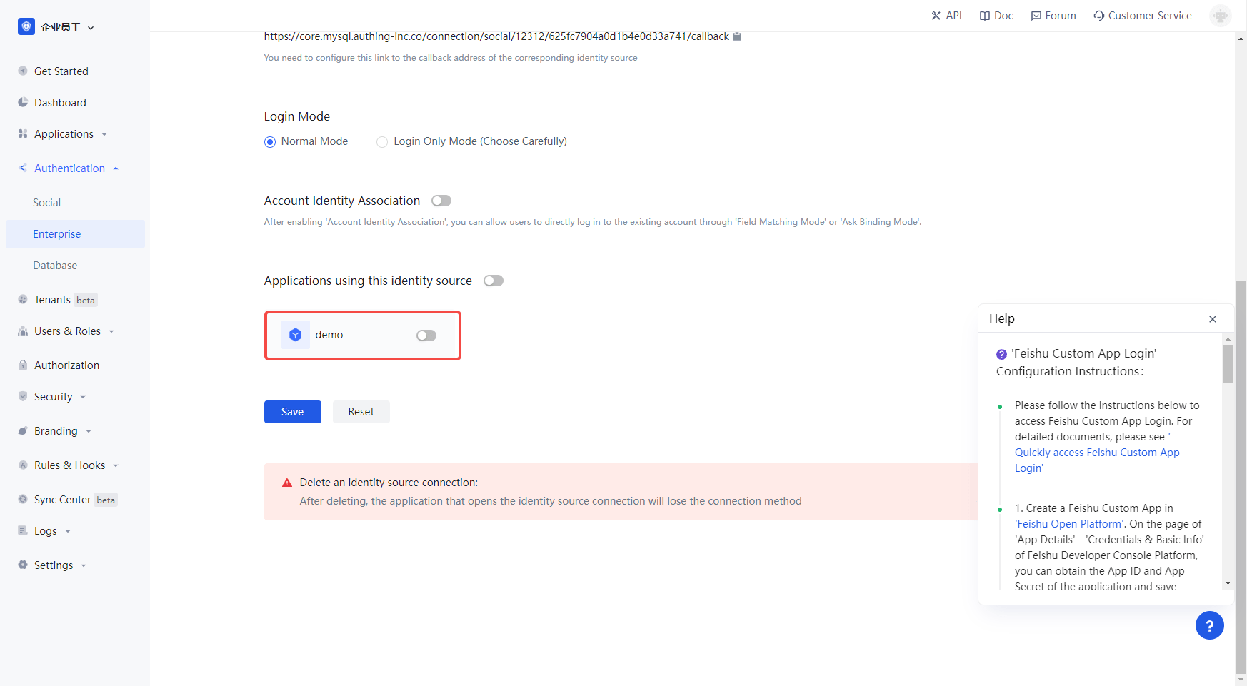 3.2 In the created FeiShu enterprise app identity source connection details page, open and associate an app created in the Authing console