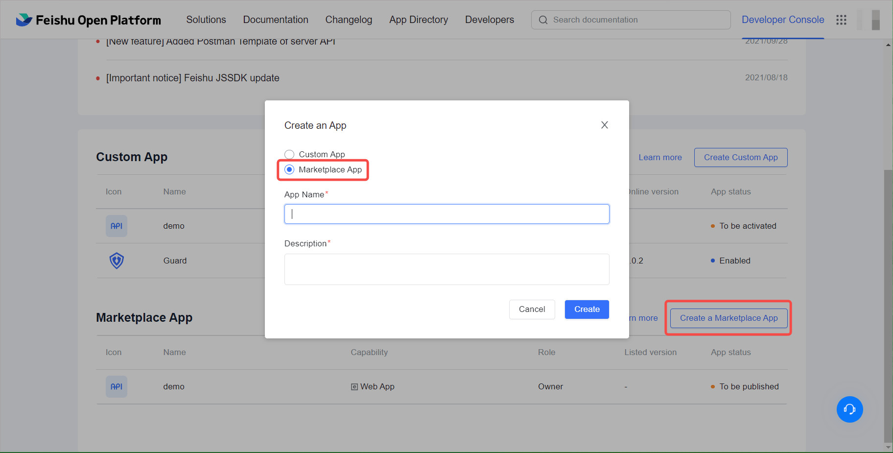 Go to Feishu Developer Console (opens new window), click Create Enterprise Enterprise App, fill in the appropriate content and create the app.