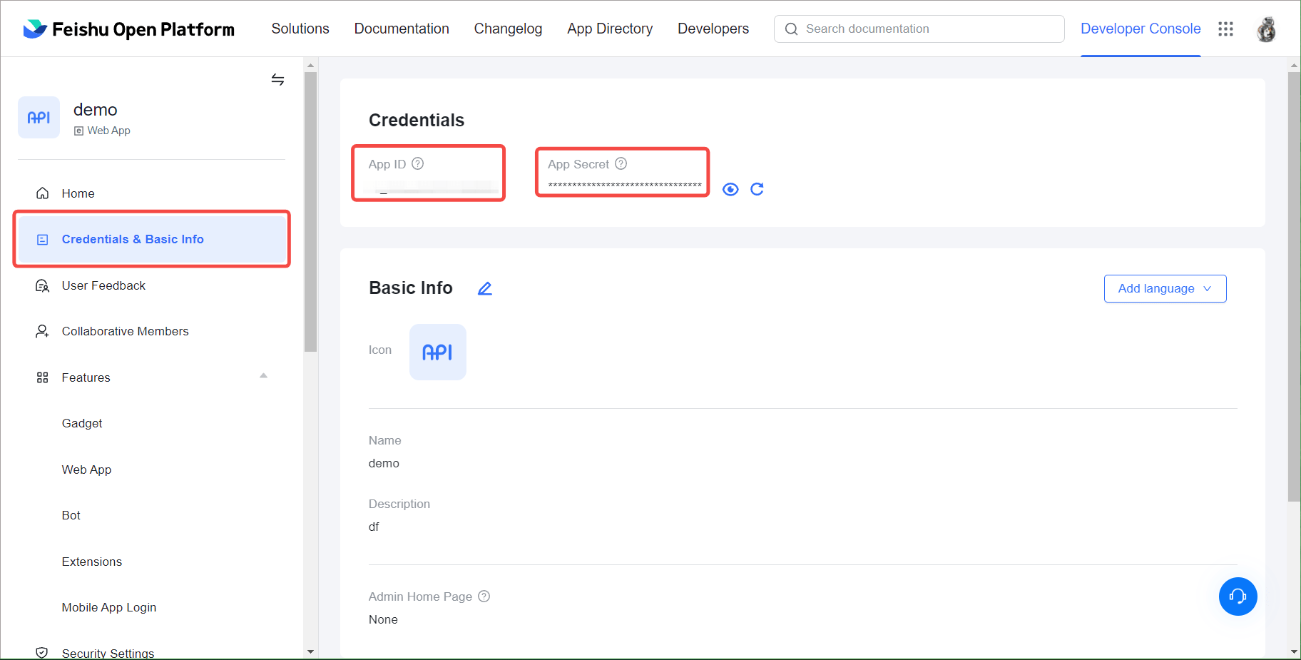 App ID and App Secret, fill in the App ID and App Secret in Credentials and Basic Info in the backend of Feishu app.