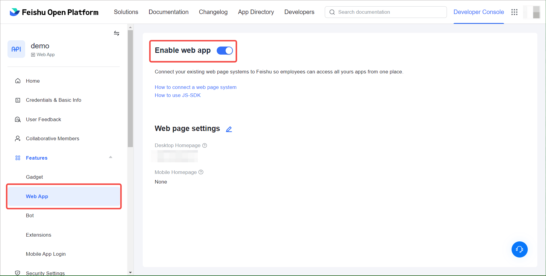Go to the created app, click Application Features, select Web Pages and turn on the Enable Web Pages feature.
