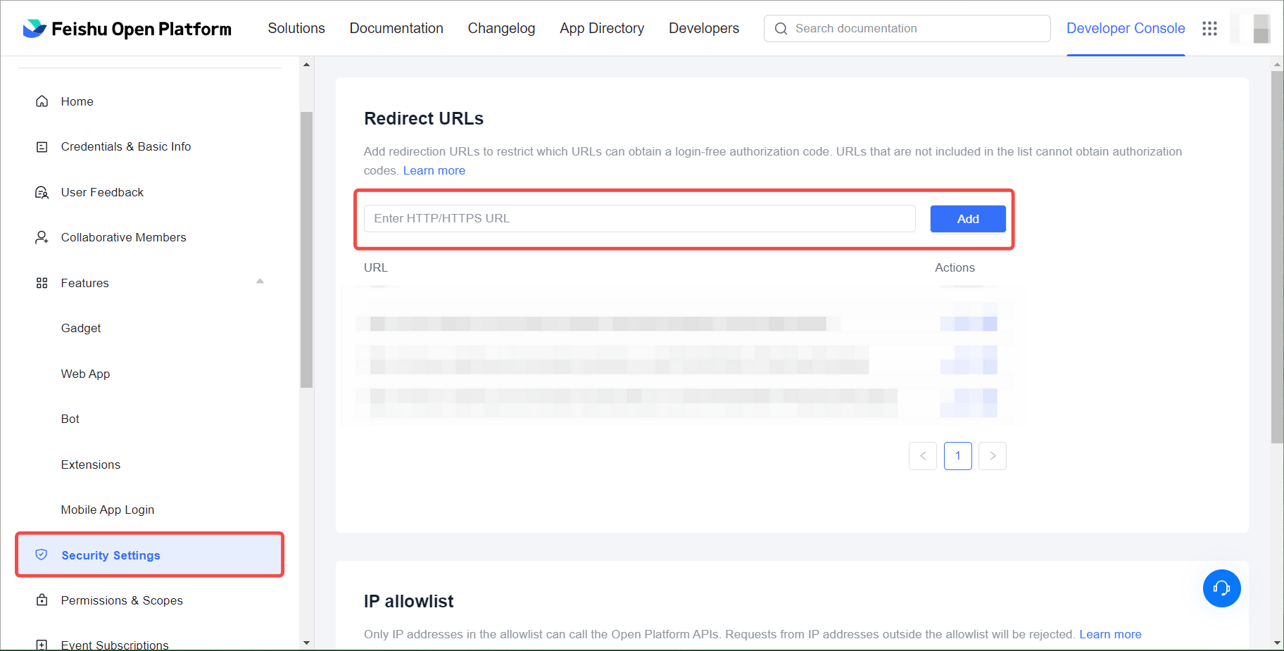 In Feishu Open Platform, open the application management page, select Security Settings, add the callback address of Authing backend to Redirect URL.