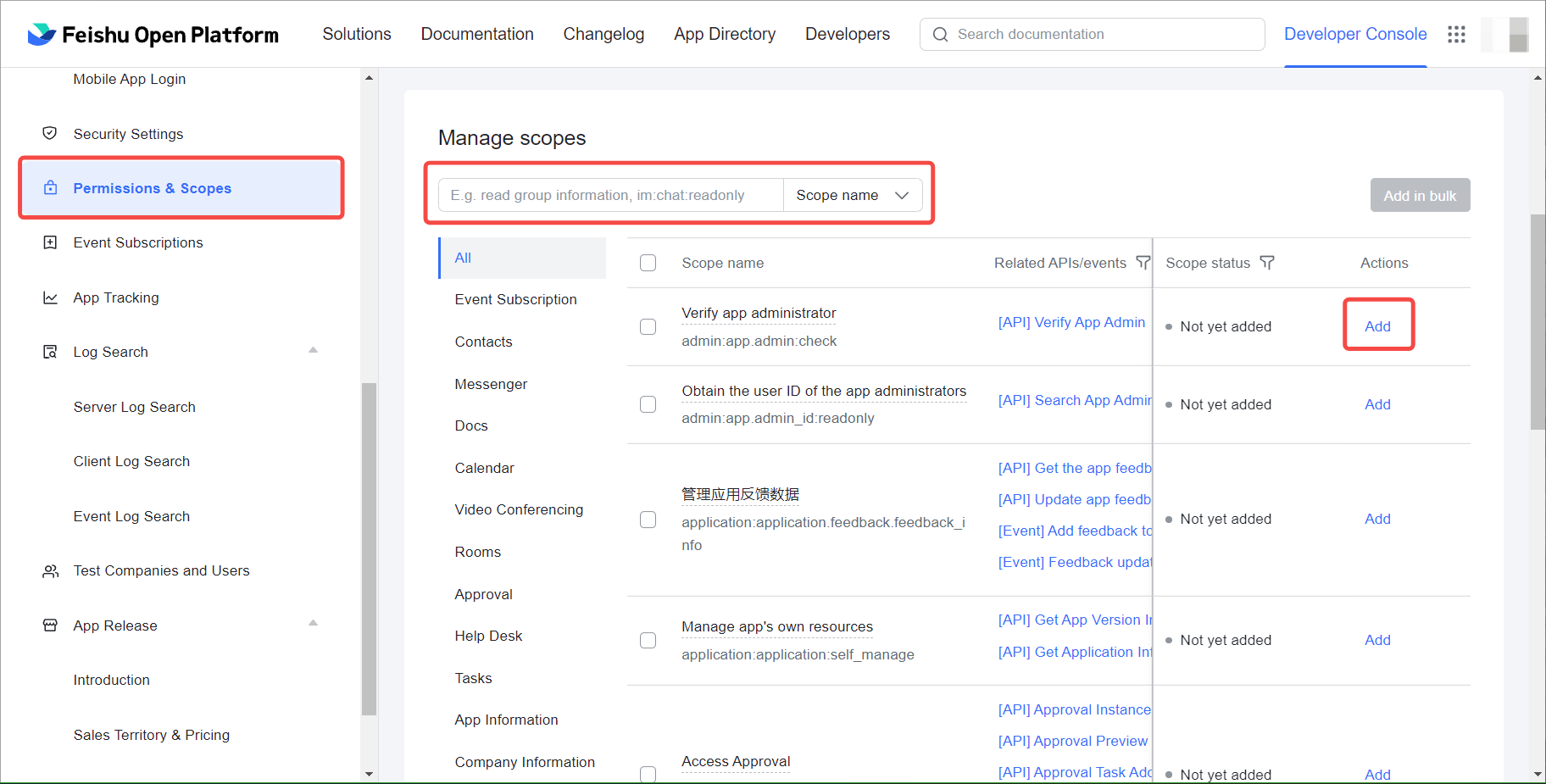 In order to get the user information of Feishu properly and complete the authentication process, you need to complete the Permissions Configuration on the Permissions Management page, search for the following permissions, and turn on.