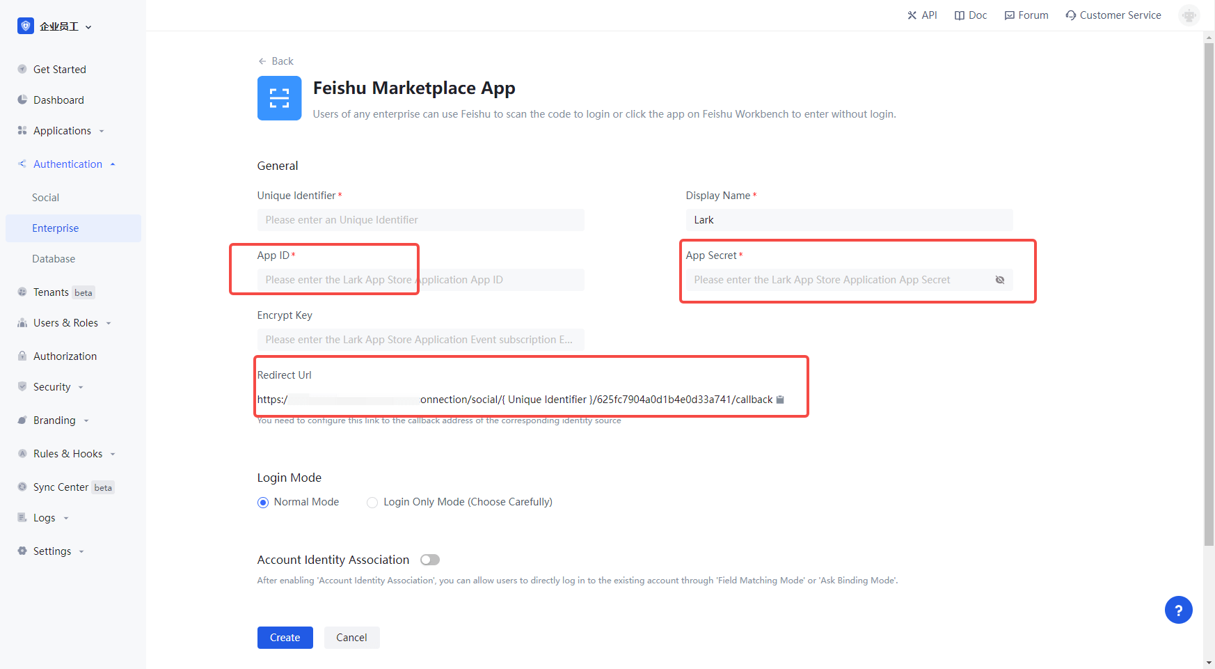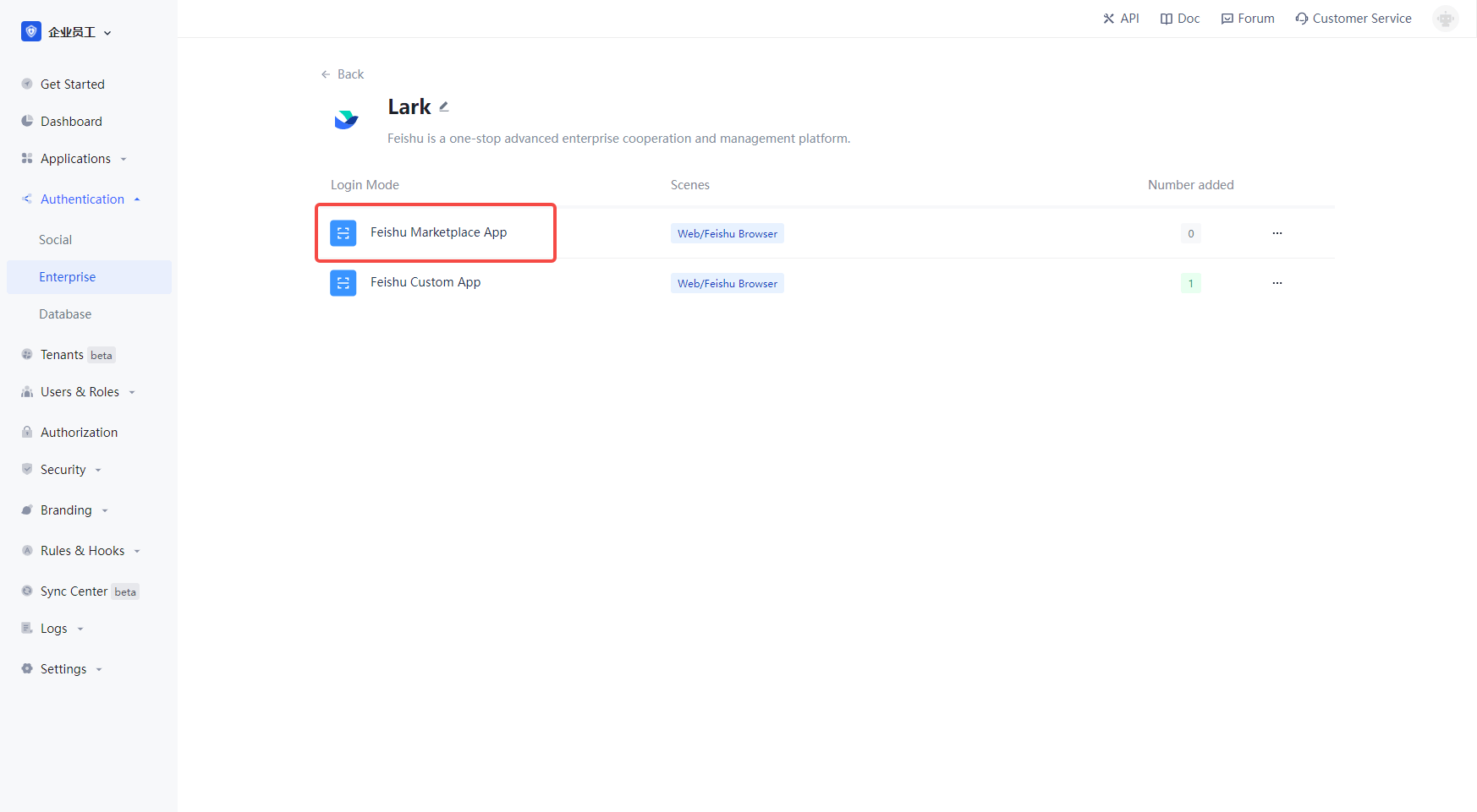 - Overview: Feishu Marketplace App is suitable for your own enterprise PC website sweep login and Feishu Workbench no-login scenario. For enterprises to achieve secure login to third-party applications or websites with Feishu as the identity source. Configure and enable the enterprise login of Feishu enterprise application in Authing, you can quickly get the basic open information of Feishu and help users to achieve the no-sign-in function by Authing.