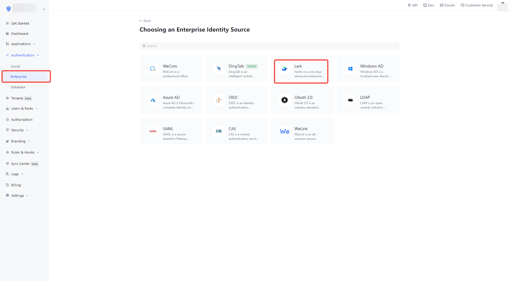 2.1 On the "Enterprise Identity Source" page of Authing Console, click the "Create Enterprise Identity Source" button, go to the "Select Enterprise Identity Source" page, and click the "Feishu" identity source button.