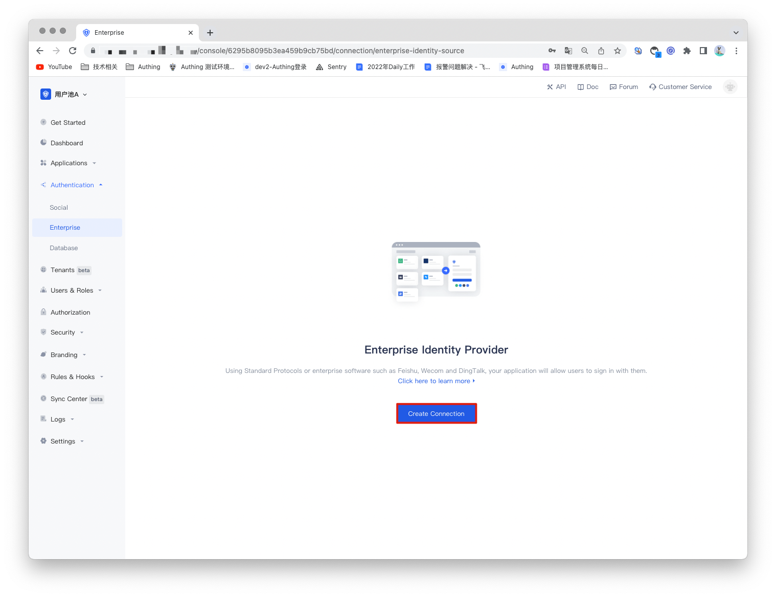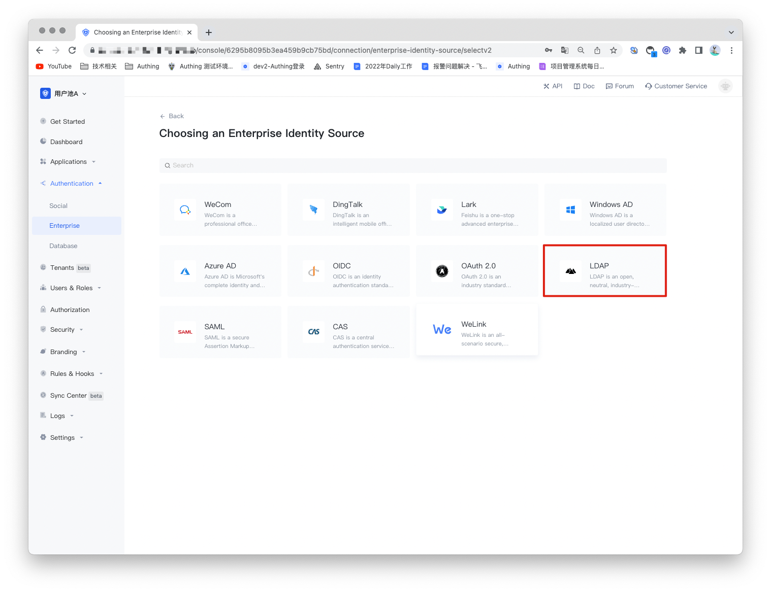 2.1 Open the Authing console and enter the user pool that you want to connect to the LDAP identity source, here called "User Pool A". On the left menu, select Connect to Identity Source > Enterprise Identity Source, and select Create Enterprise Identity Source on the right panel.