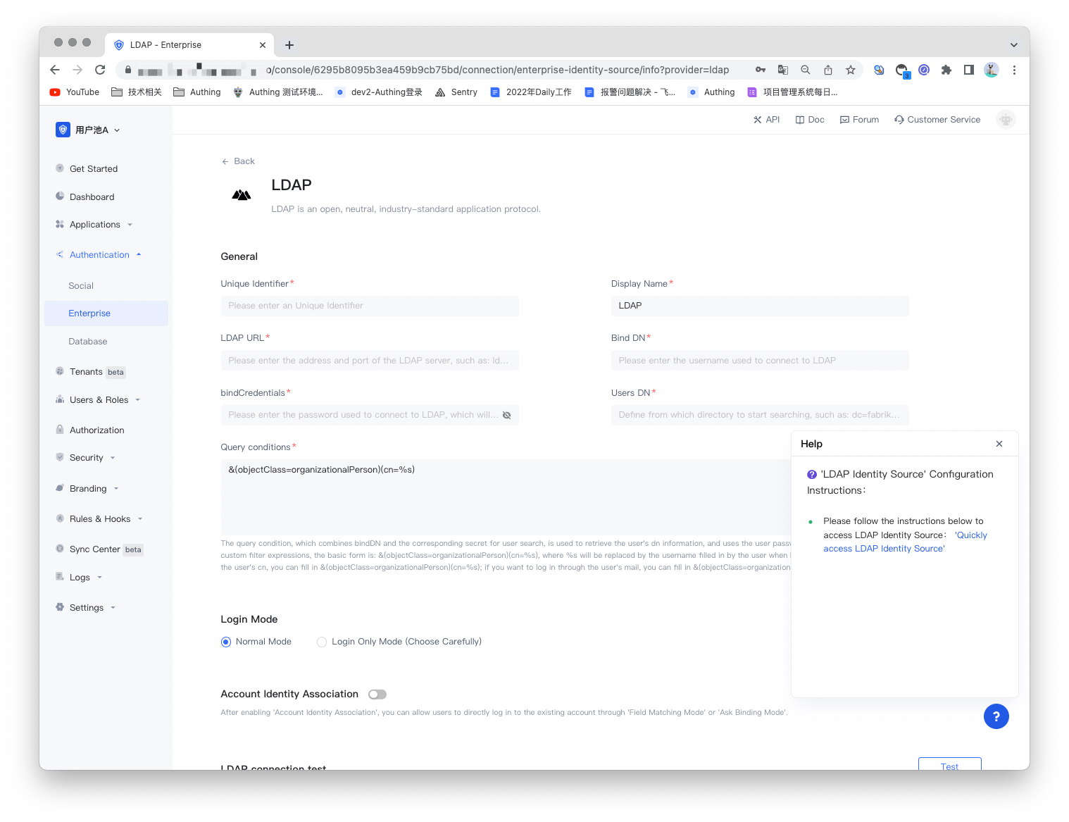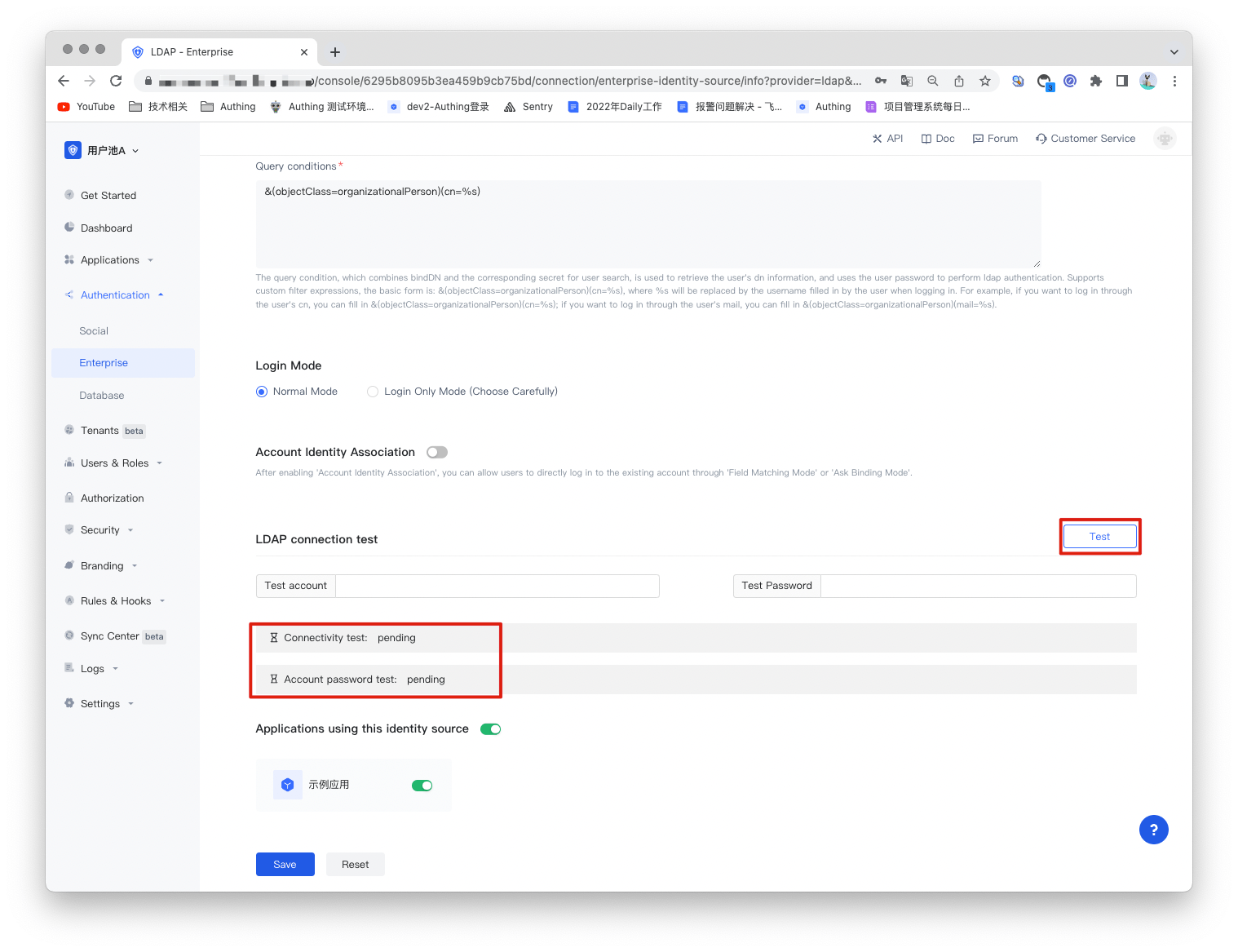 Authing also provides a test for LDAP connection to test the connectivity of the LDAP service and whether the account password is correct, helping you to check whether the parameters are filled in correctly.