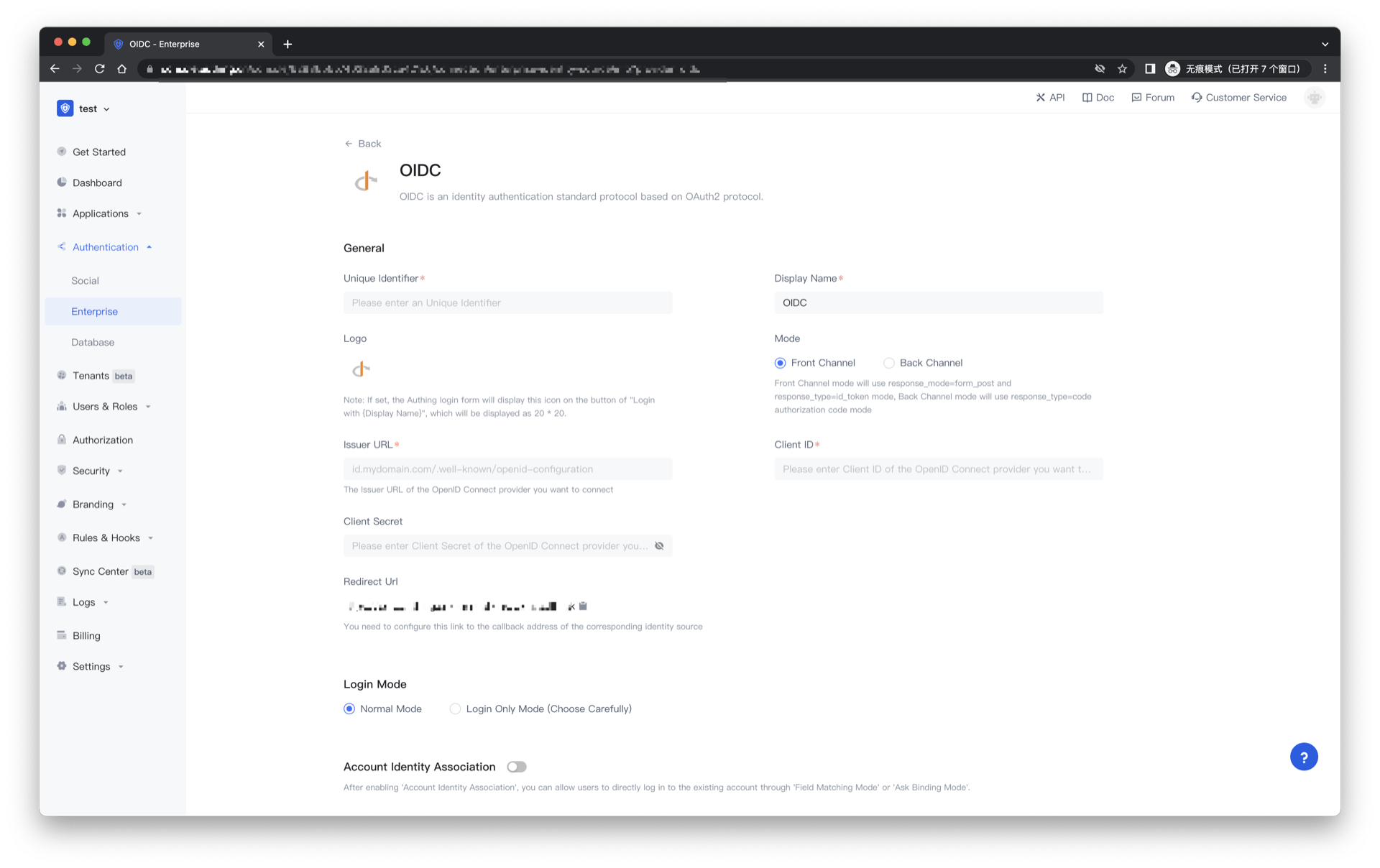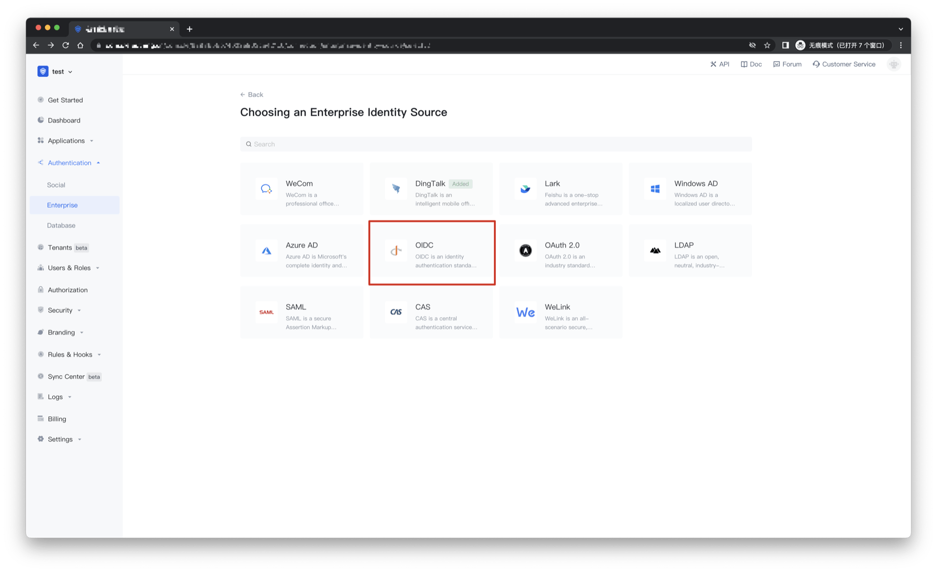 2.2 Please go to the "Enterprise" - "Choosing an Enterprise Identity Source" page of the Authing console, click the "OIDC" identity source button to enter the "OIDC Login Mode" page.