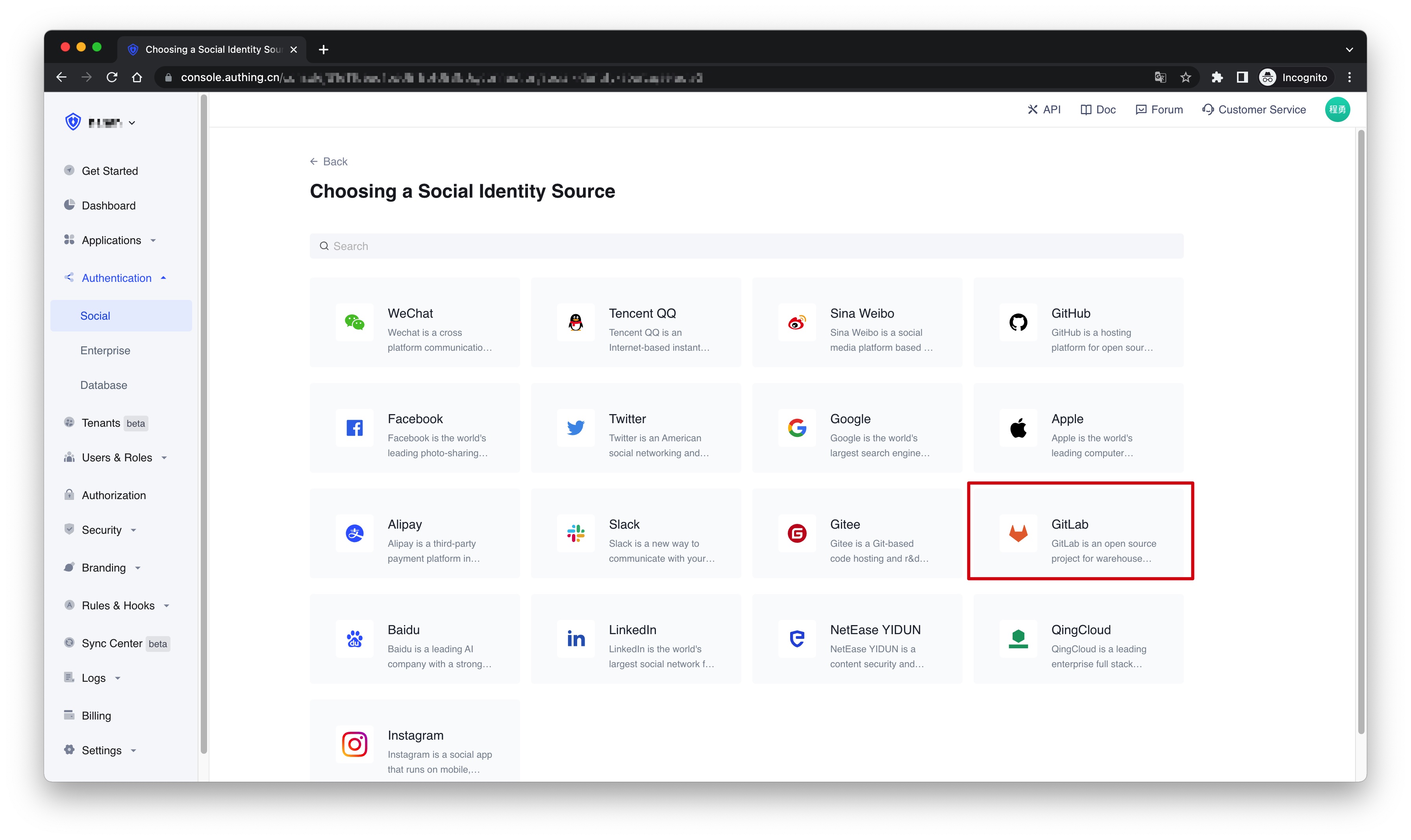 2.2 On the "Choosing a Social Identity Source" page, click the "GitLab" card.