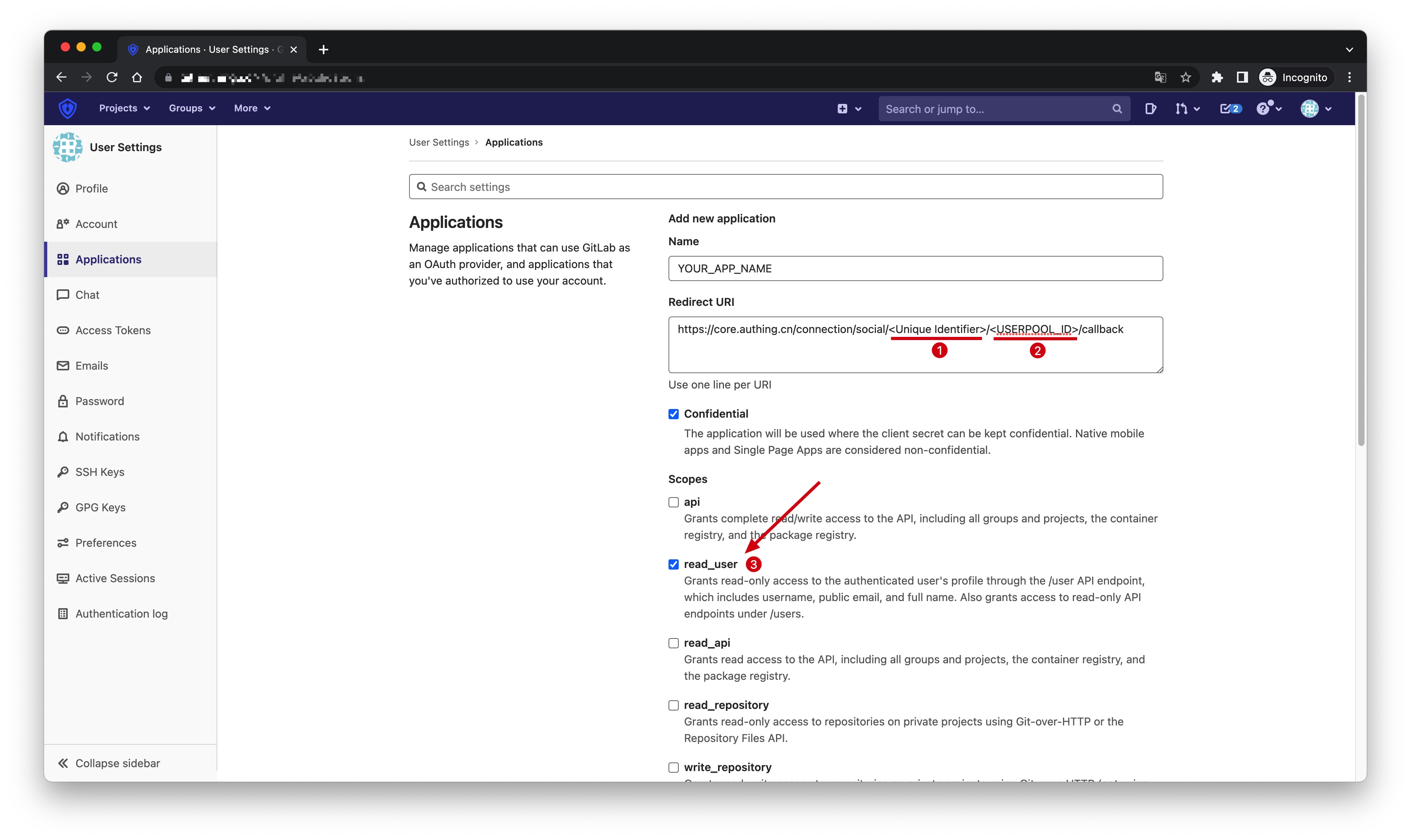 ¶ Step 1: Create an application in GitLab (or your GitLab instance)