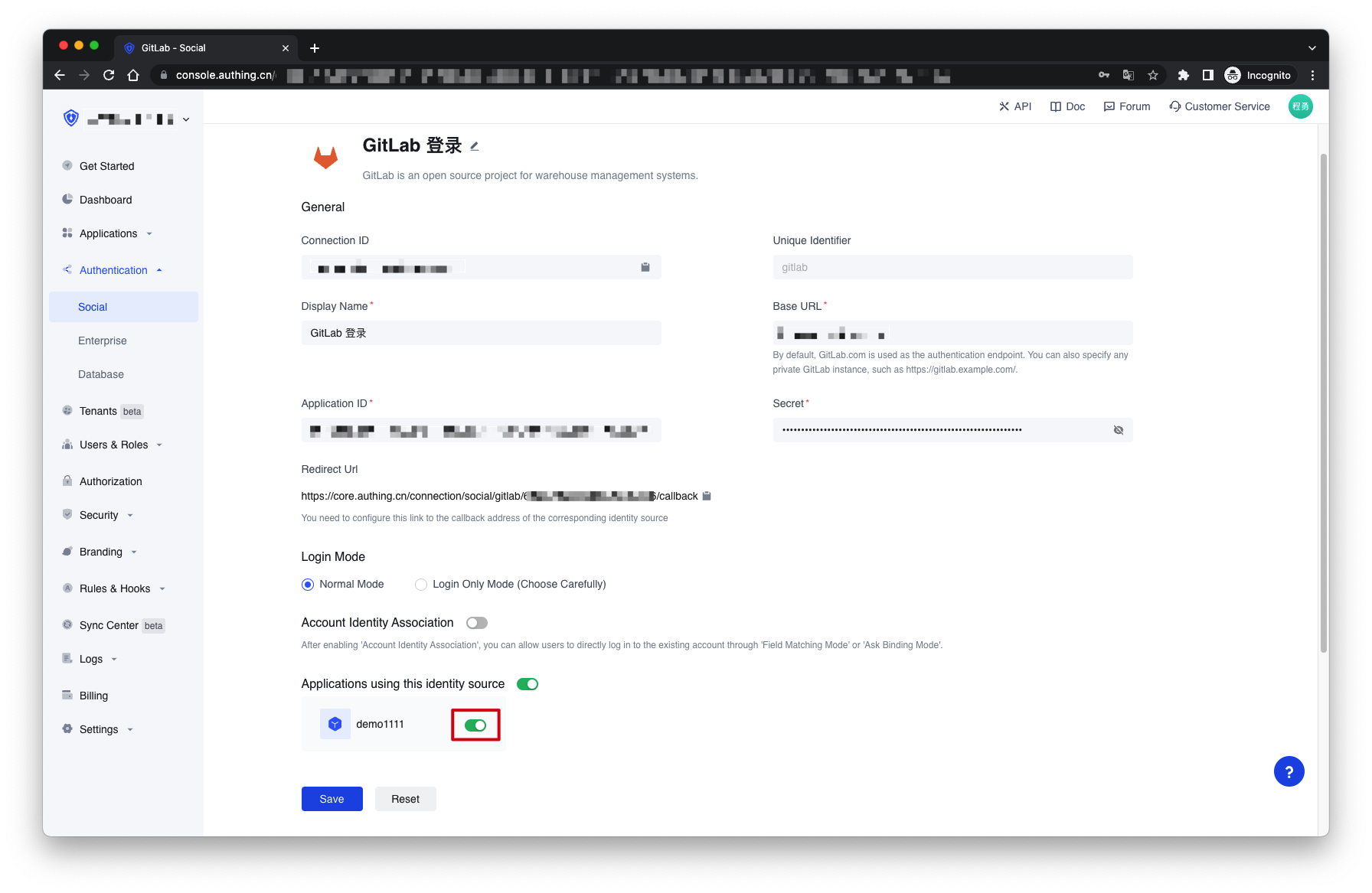 3.2 On the created "GitLab" identity provider connection details page, open and associate an application created in the Authing Console