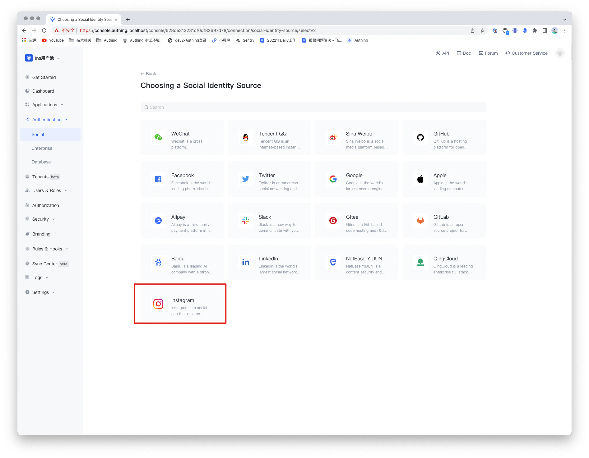 2.2 请在 Authing Console 控制台 的「社会化身份源」-「选择社会化身份源」页面,点击「Instagram」身份源按钮,进入 「Instagram 登录模式」页面。