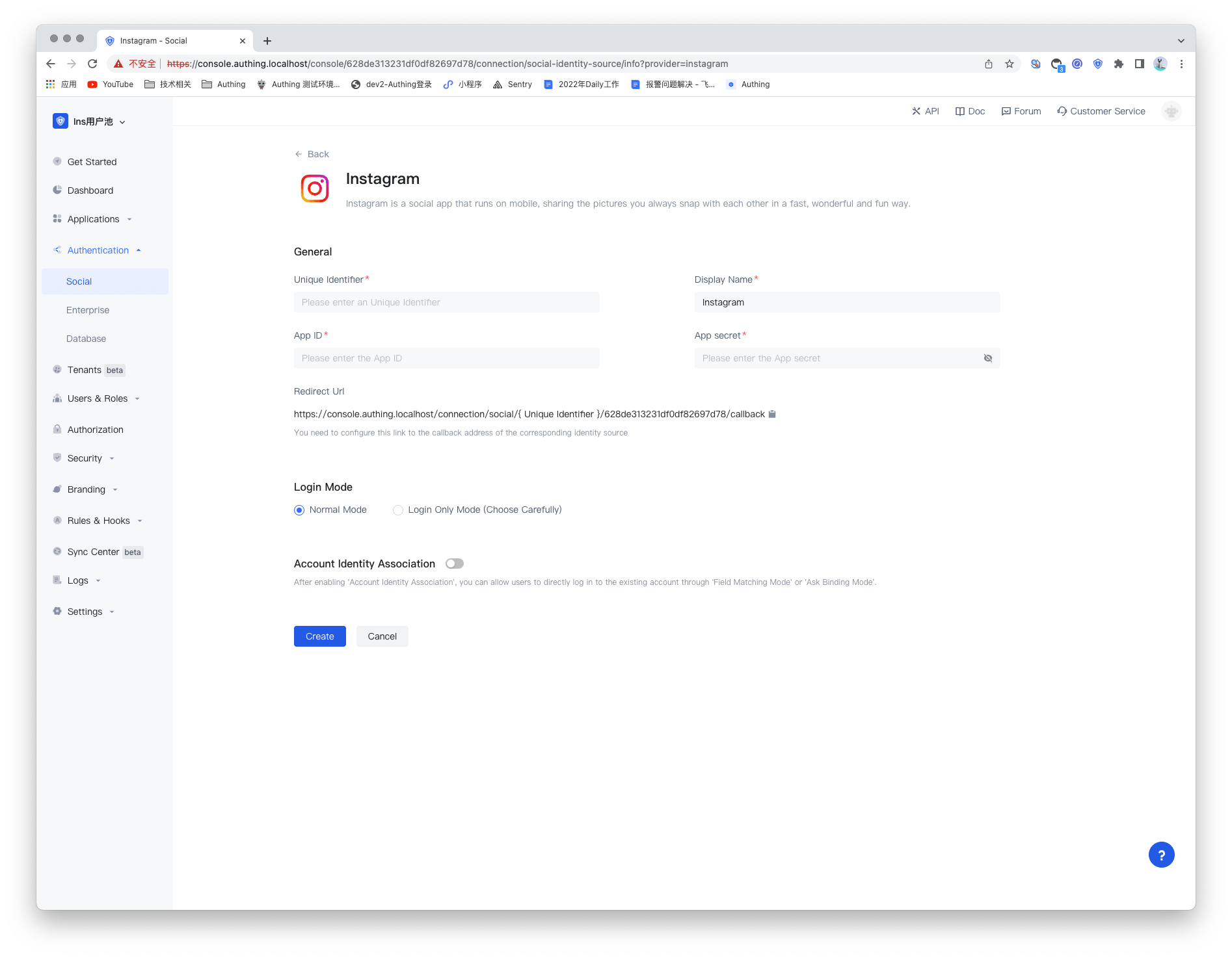 2.3 Please configure the relevant field information on the 「Social Identity Sources」 - 「Instagram」 page of the Authing Console.