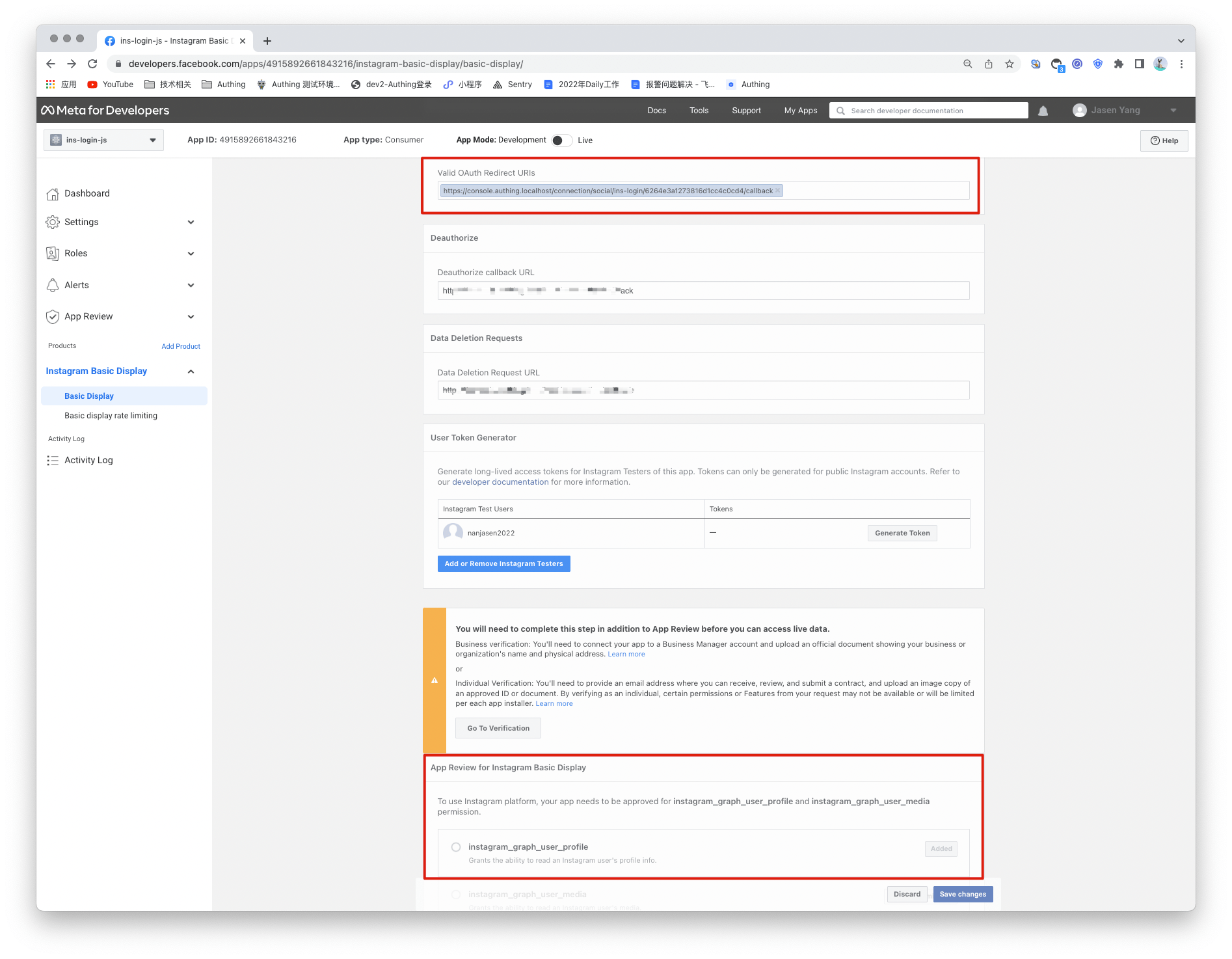 After creating the Instagram identity source on the Authing console, you need to configure the callback address to the OAuth client authorization settings in the Instagram app on Instagram's open platform.