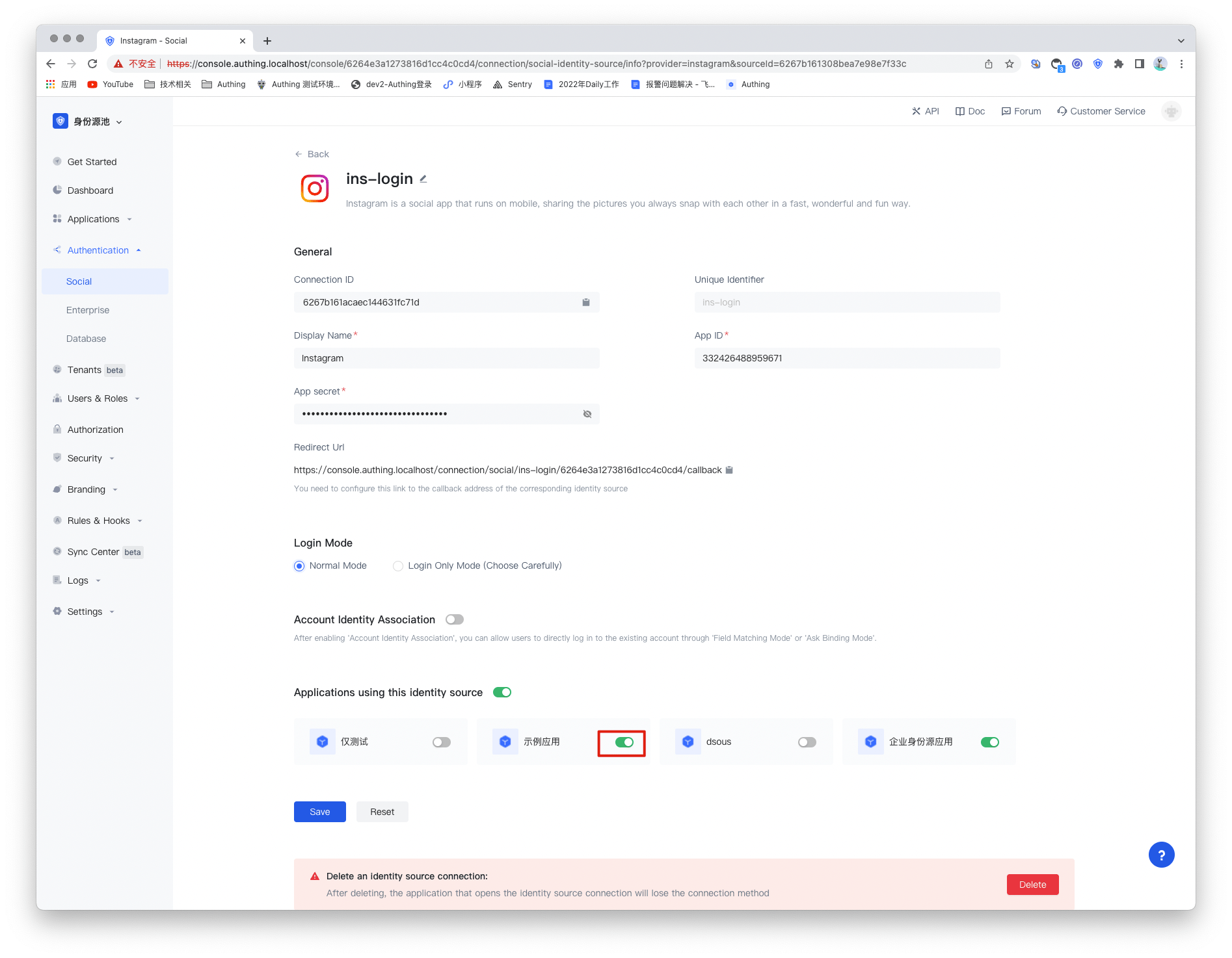 3.2 On the created Instagram identity source connection details page, open and associate an app created in the Authing console