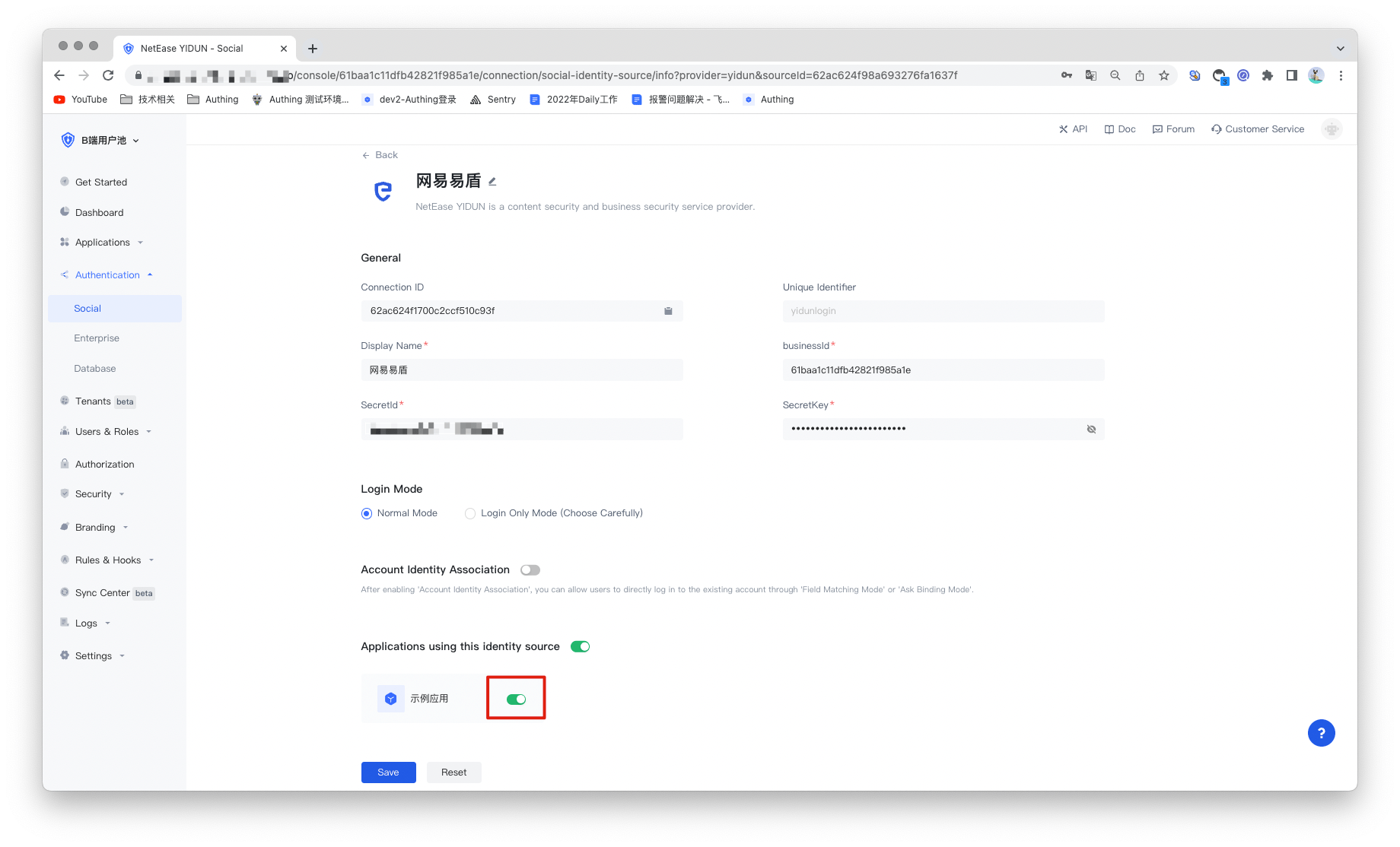 3.2 On the created YiDun identity source connection details page, open and associate an application created in the Authing console.