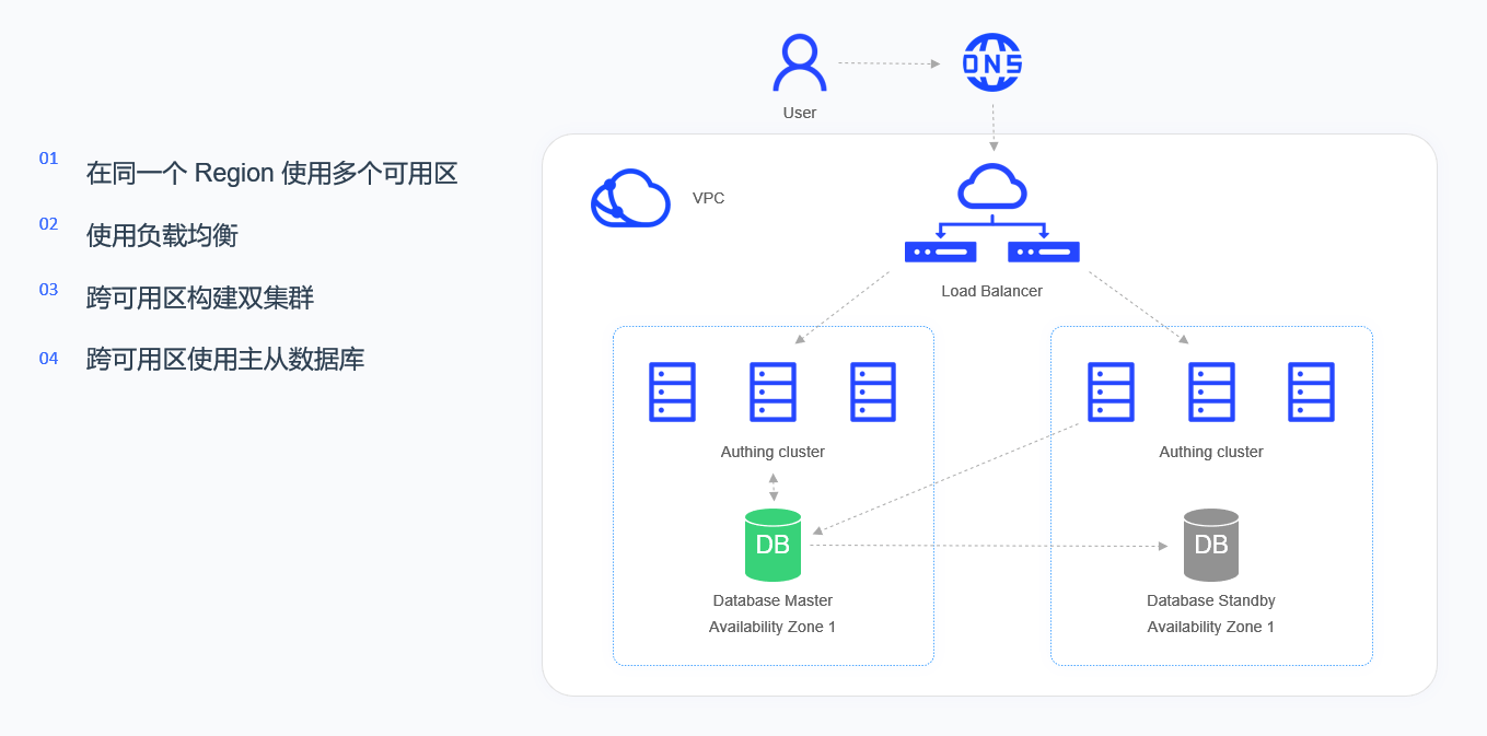 The high-availability architecture of the Authing IDaaS platform is running in VPC (virtual private cloud), through LB (load balancing), multi-availability server clusters in the same region are virtualized into a high-performance and highly available service pool as a whole. Based on load balancing Rules, the request from the client is distributed to the availability zone in the service pool.