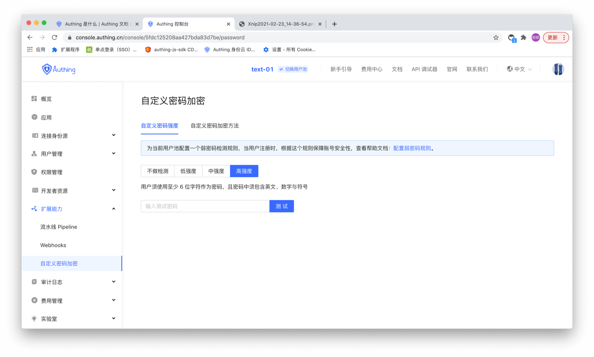 You can configure the password strength on the Extended Capabilities -> Custom Password Encryption page. After the strength option is enabled, the system will require all users to register and modify their passwords. The password must meet a certain level of complexity.