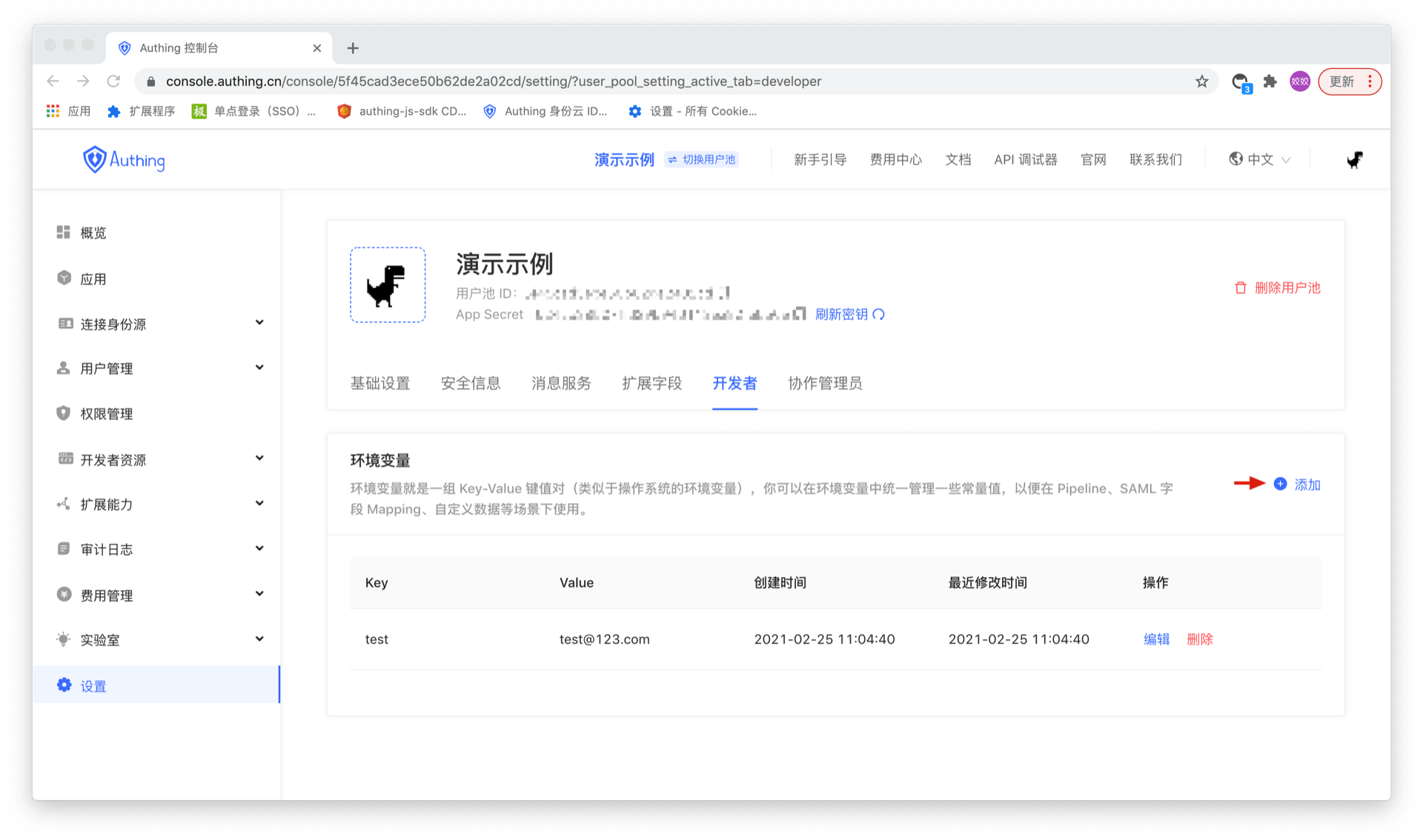 Developers can configure environment variables. Environment variables are a set of Key-Value key-value pairs (similar to operating system environment variables). You can configure some constant values in environment variables to facilitate the scinaro of Pipeline, mapping SAML fields and user-defined data. Go to Settings -> Developer page and click the Add button to add environment variables.