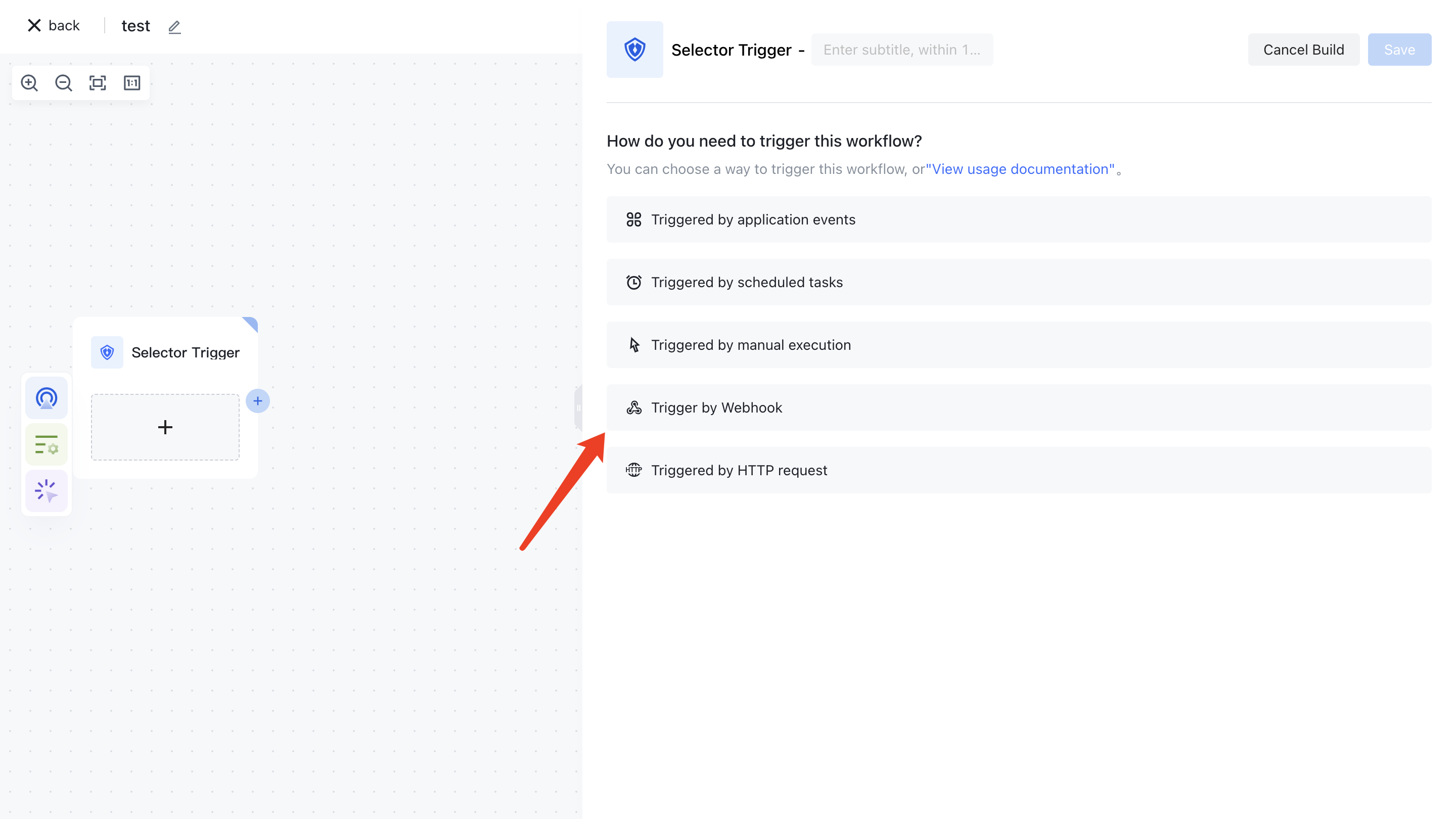 When selecting a trigger, choose the "trigger through Webhook" method: