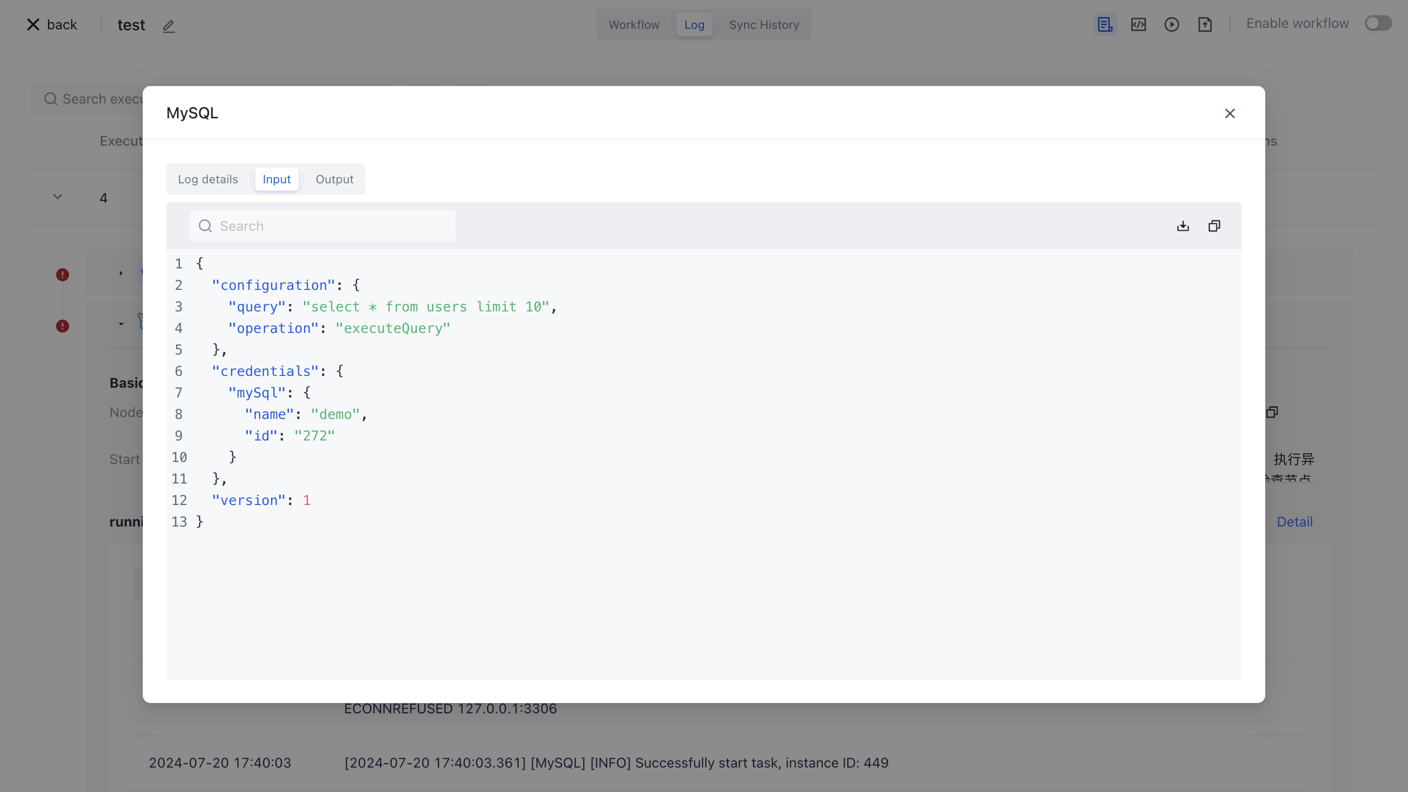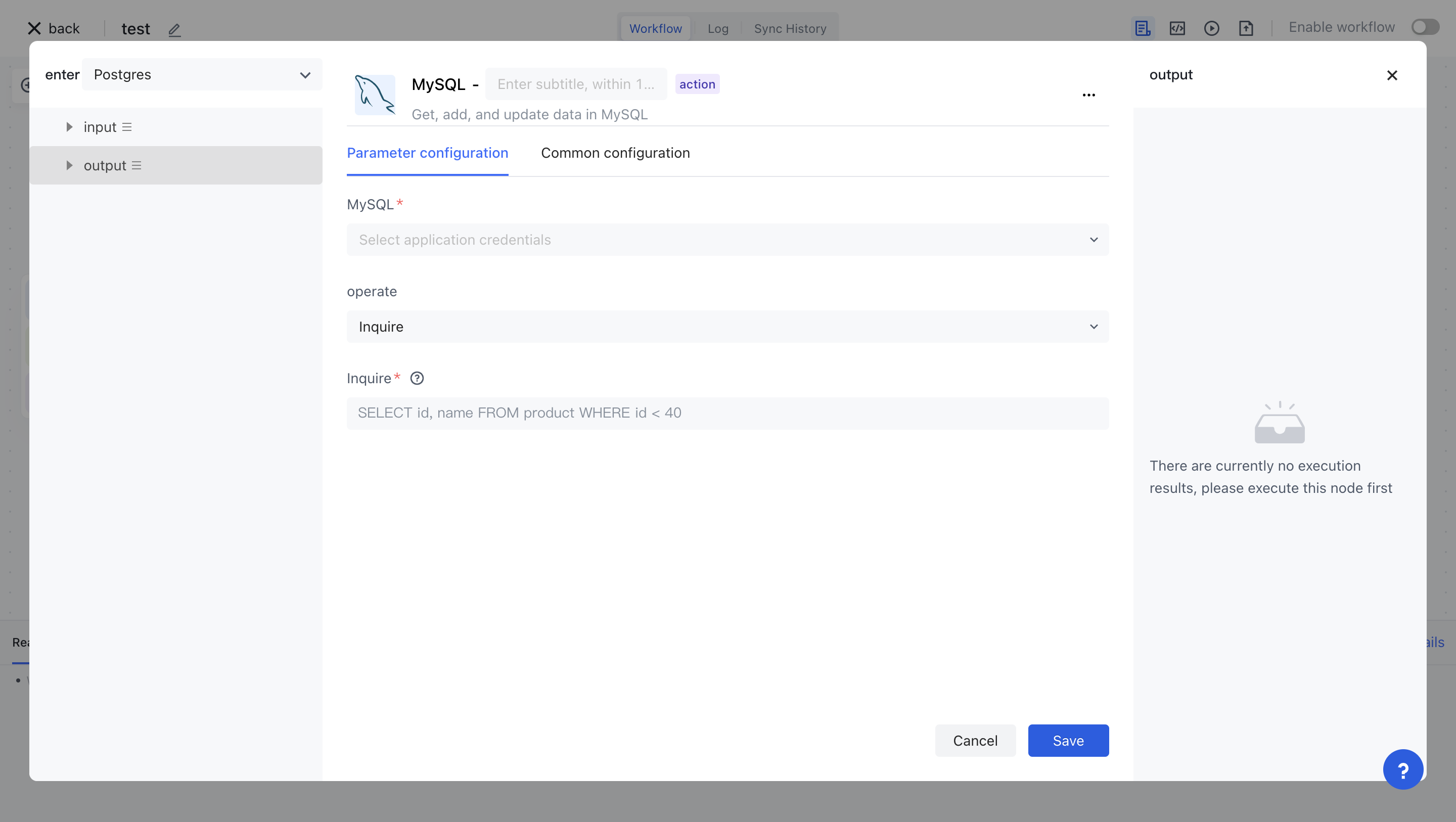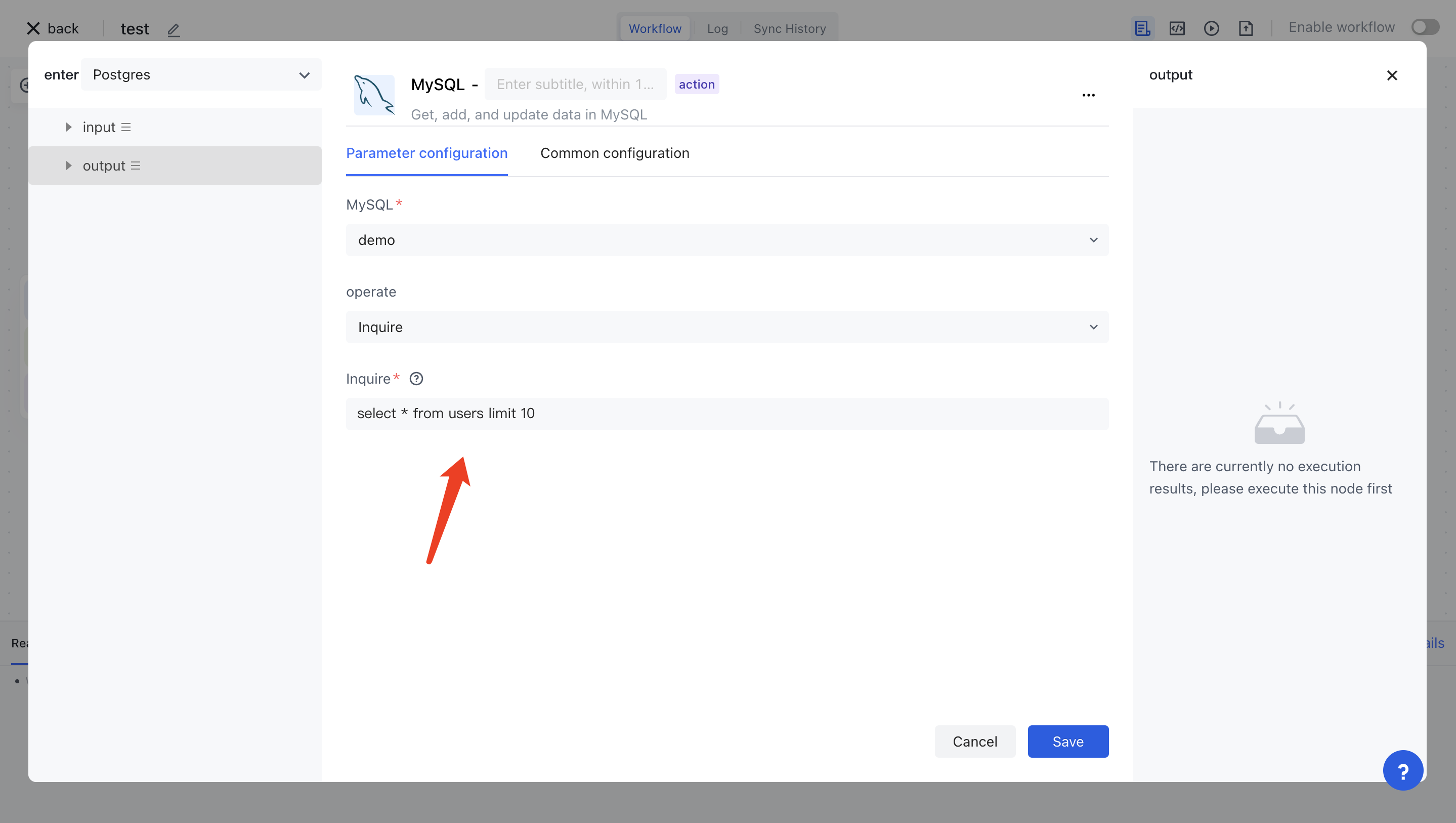 Set the operation of MySQL nodes to execute queries and write in query statements select * from users limit 10: