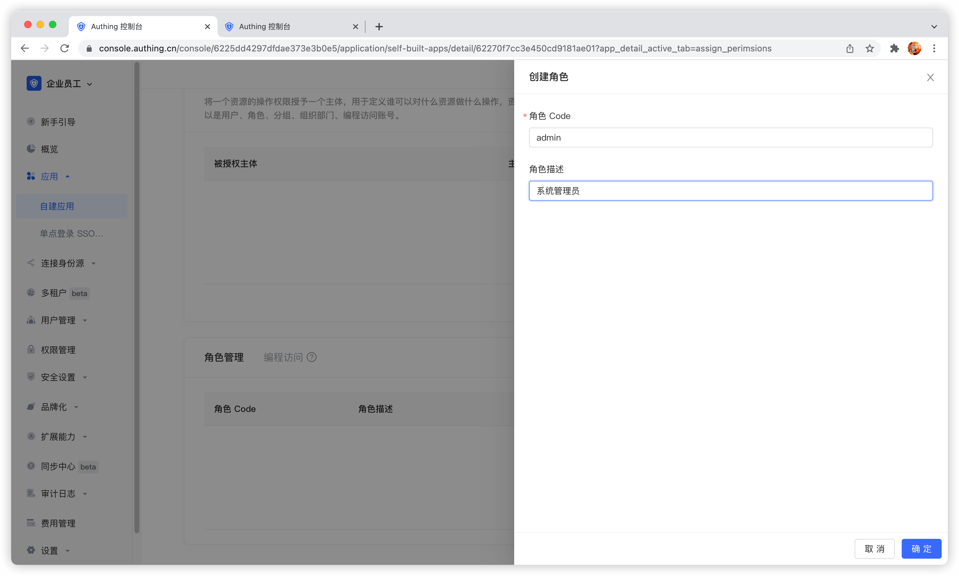 在应用详情 - 访问授权 菜单的 角色管理卡片中,点击右边的添加按钮: