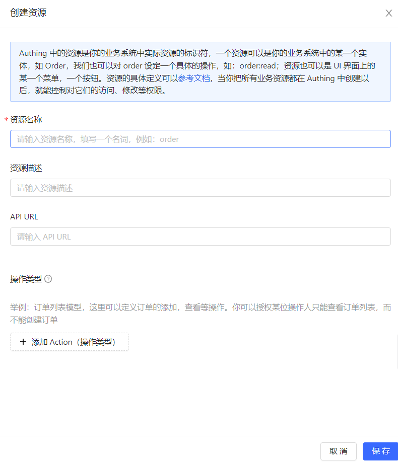 - 在侧拉框 创建资源 窗口输入填写资源信息,定义操作类型。