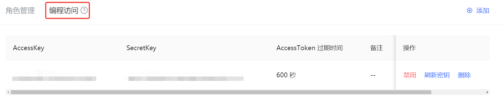 管理员可以在编程访问账号列表 禁用、刷新密钥 和 删除 所在行账号。