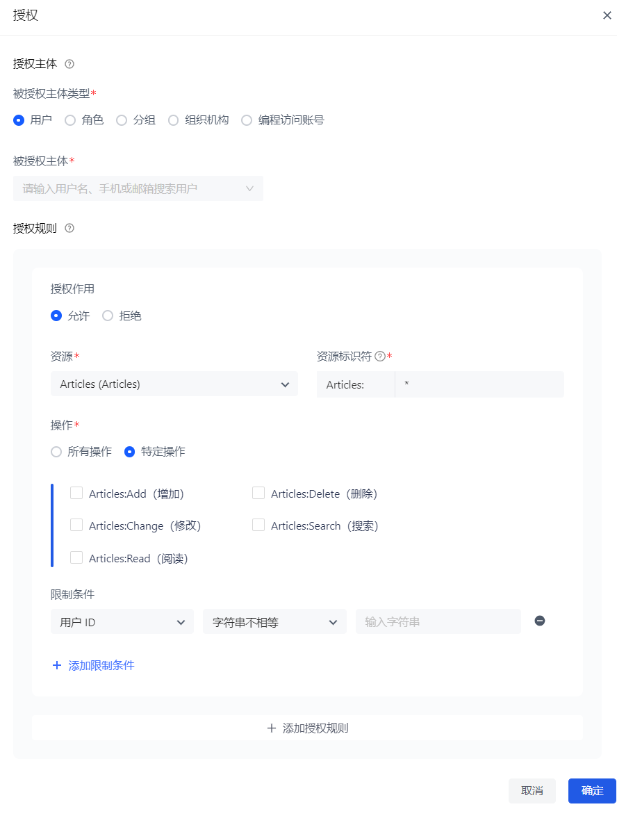 只能为单个资源指定特定操作,不可以对所有资源指定 特定操作。 - 限制条件 是对授权规则添加限制条件。
