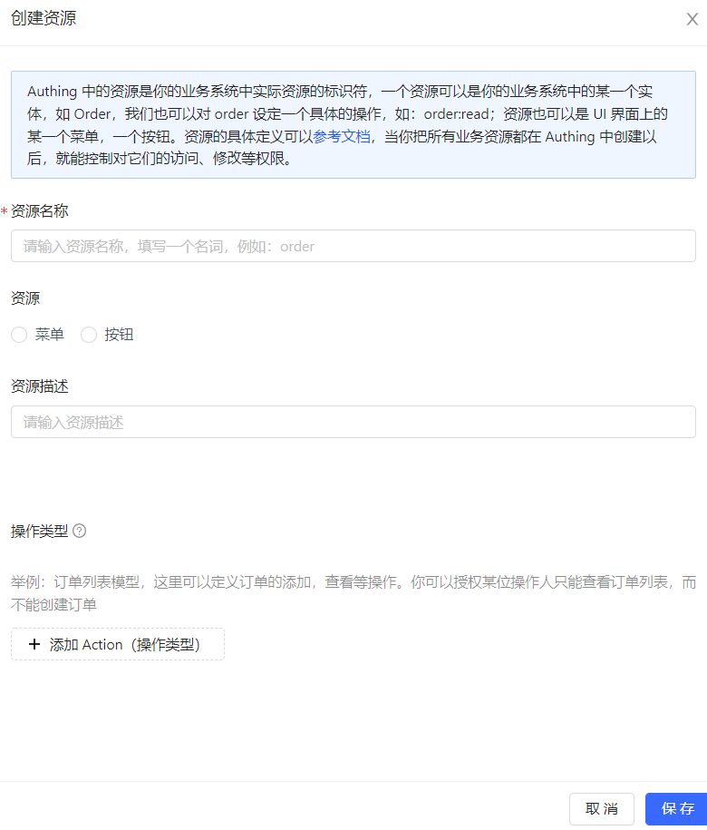 - 资源:你可以在 Authing 中定义一些资源,例如应用中的资源可能有 API、数据资源、菜单、按钮等。