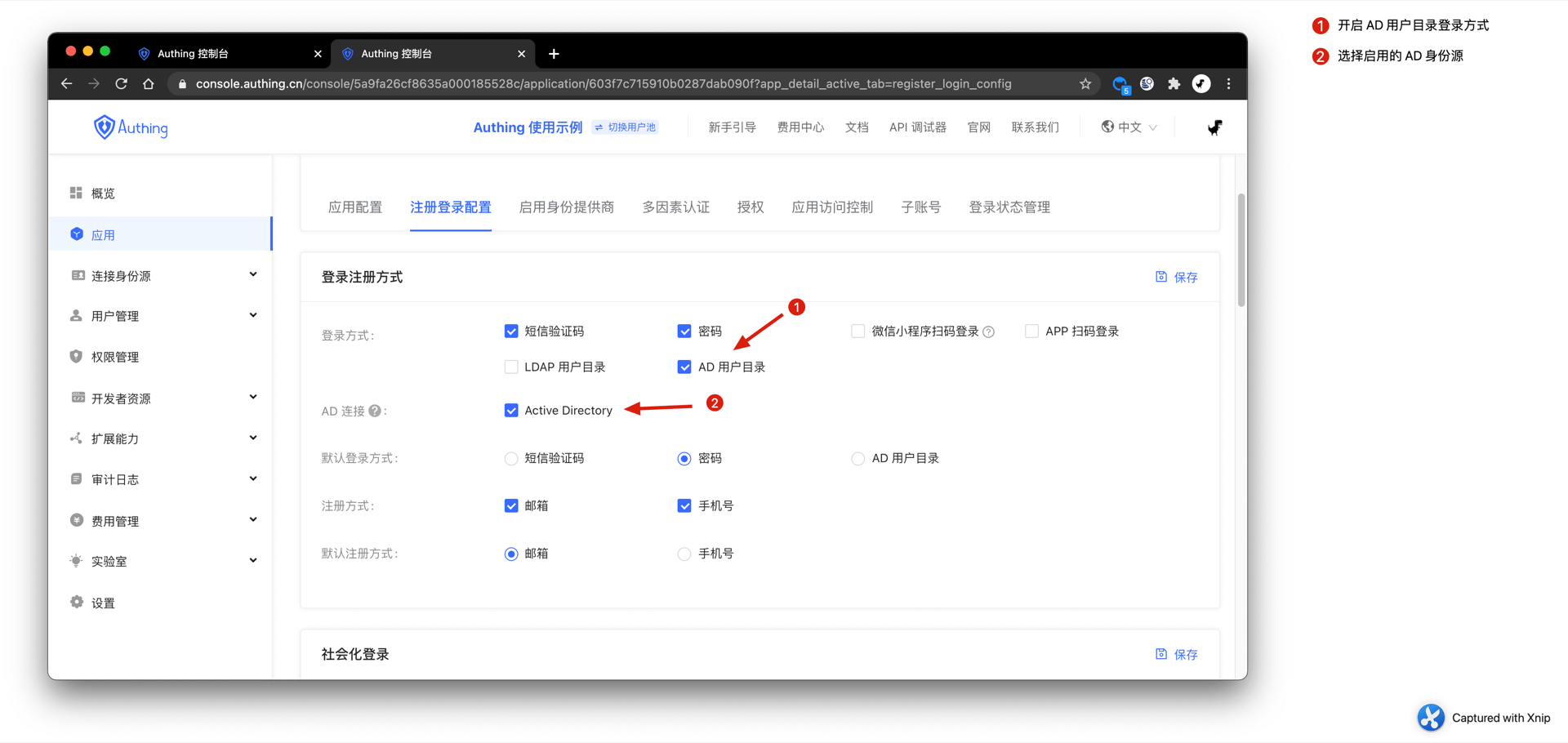配置流程请见连接 Windows Active Directory 身份源。配置完成之后,你需要在应用中开启此登录方式:
