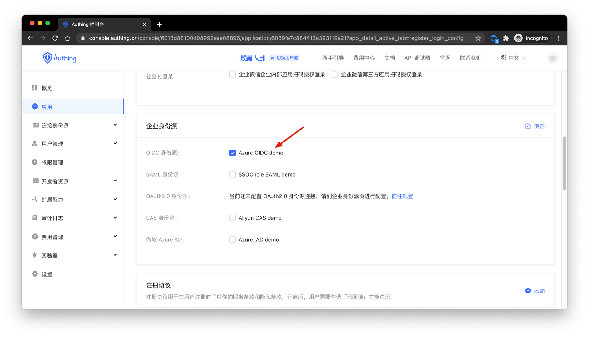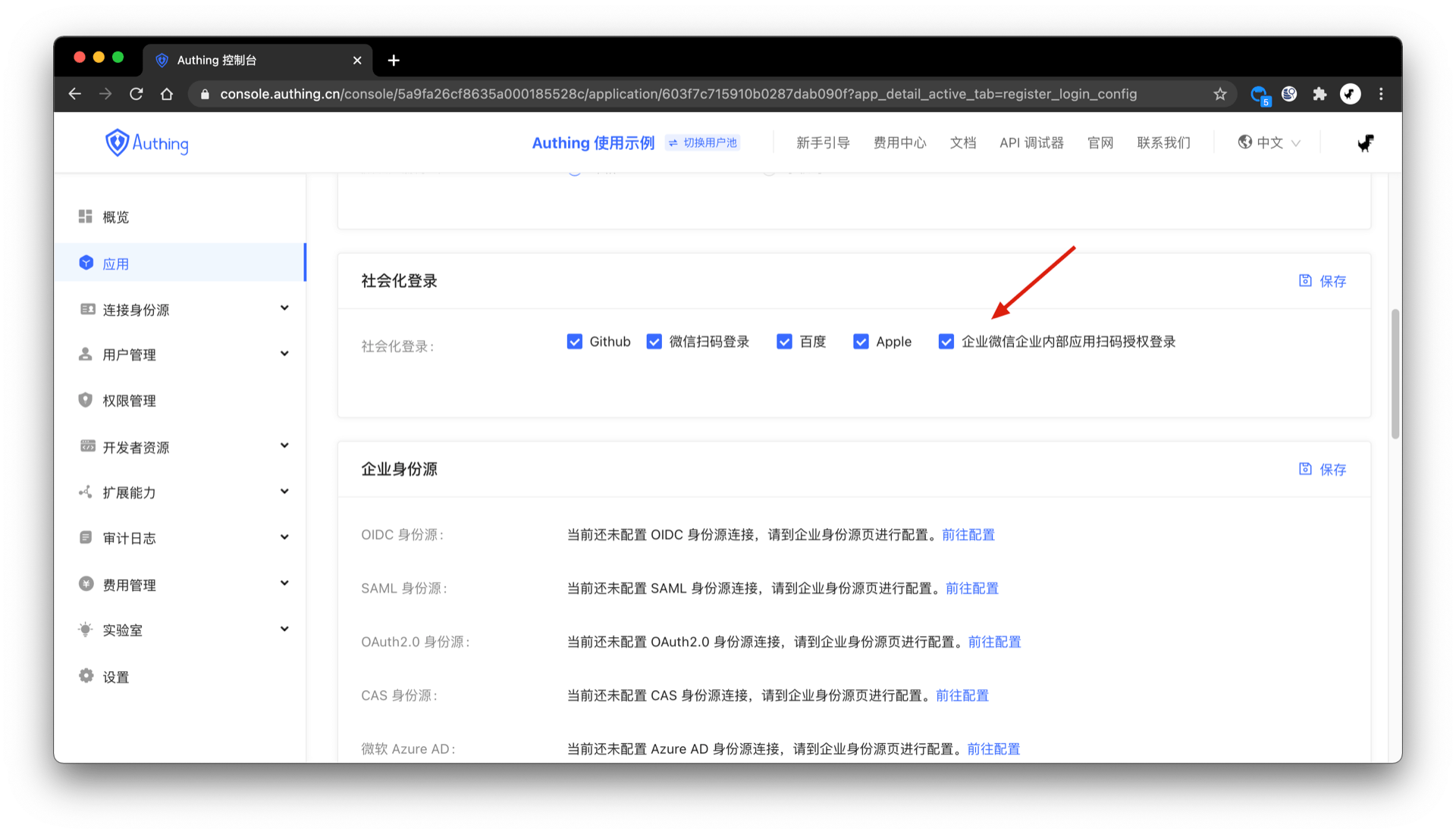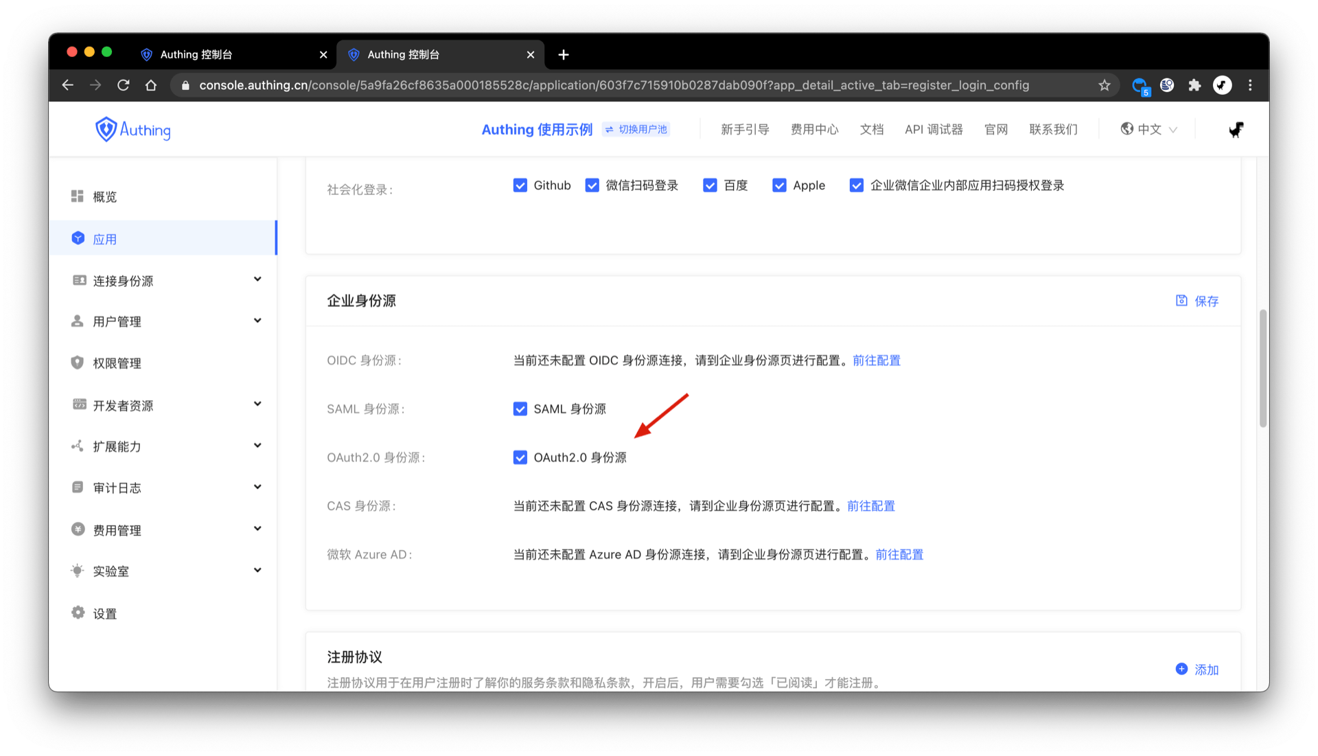 配置流程请见连接 OAuth2.0 身份源。配置完成之后,你需要在应用中开启此登录方式: