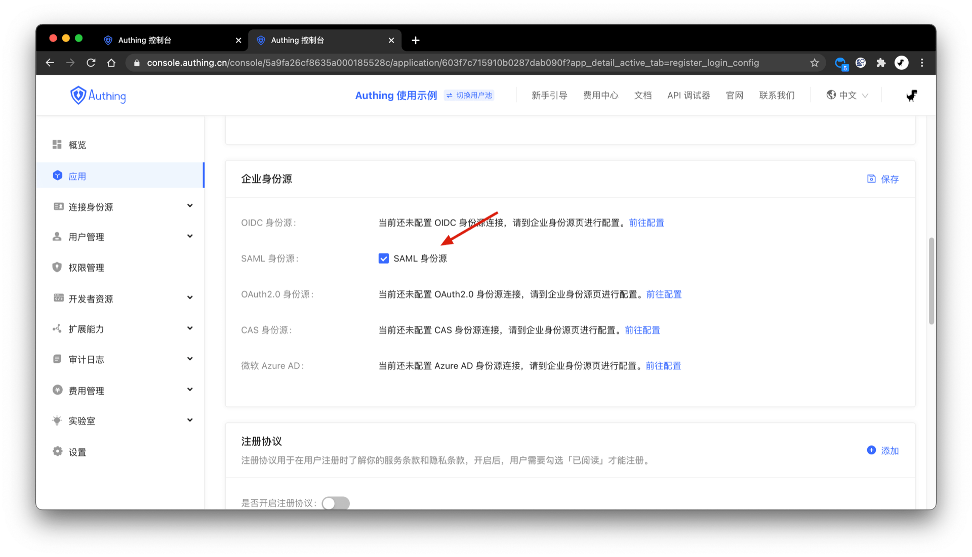 配置流程请见连接 SAML 身份源。配置完成之后,你需要在应用中开启此登录方式: