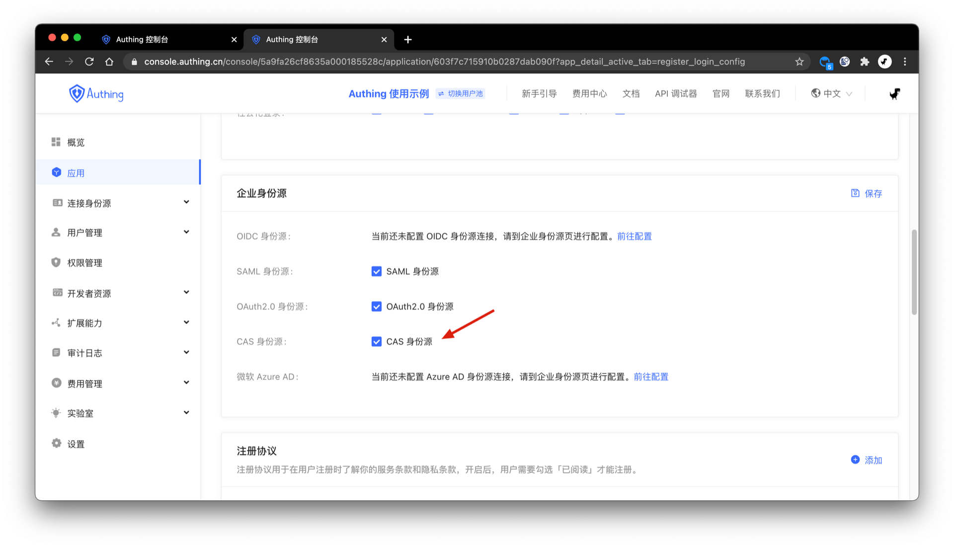 配置流程请见连接 CAS 身份源。配置完成之后,你需要在应用中开启此登录方式: