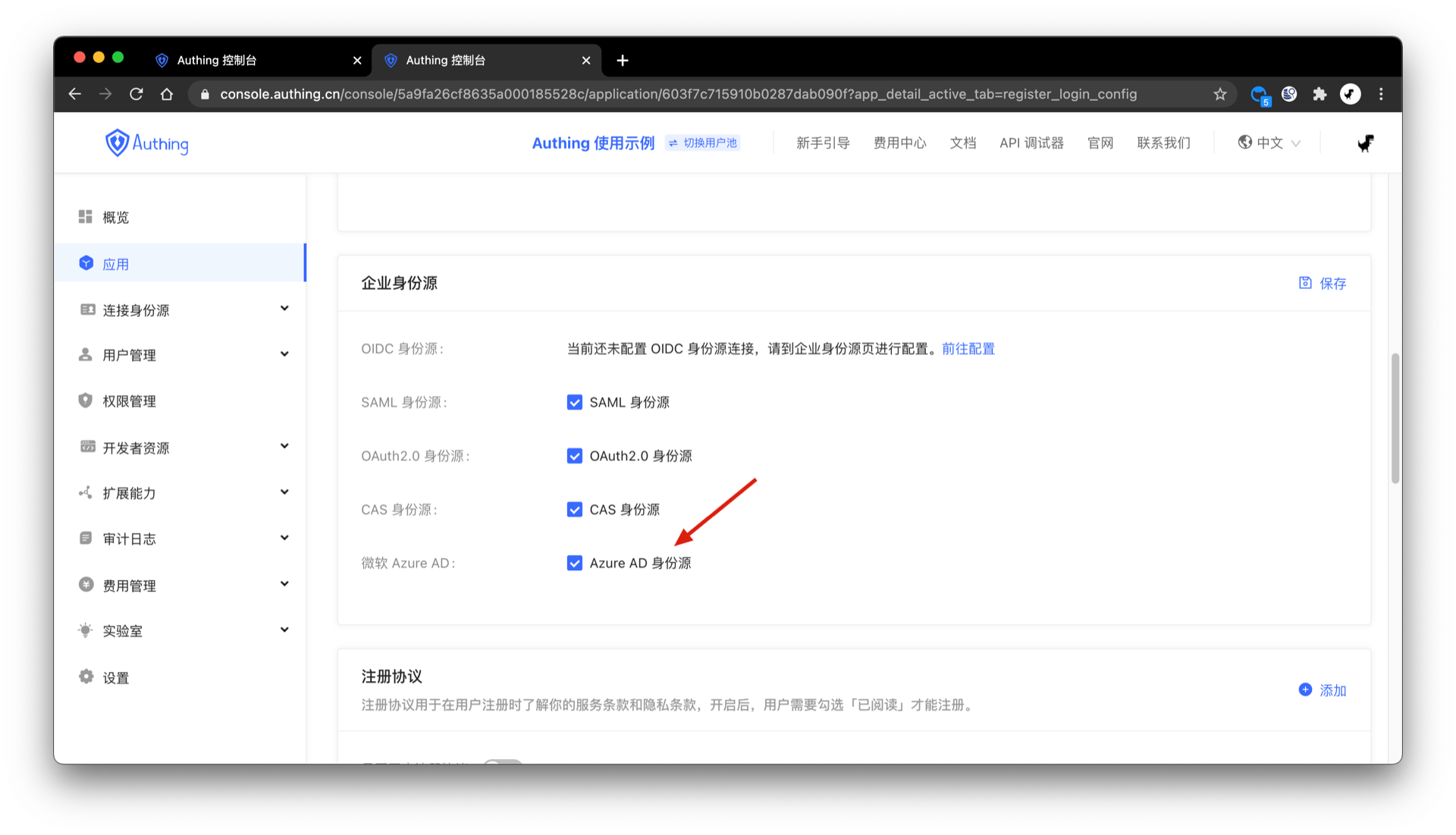 配置流程请见连接 Azure Active Directory 身份源。配置完成之后,你需要在应用中开启此登录方式: