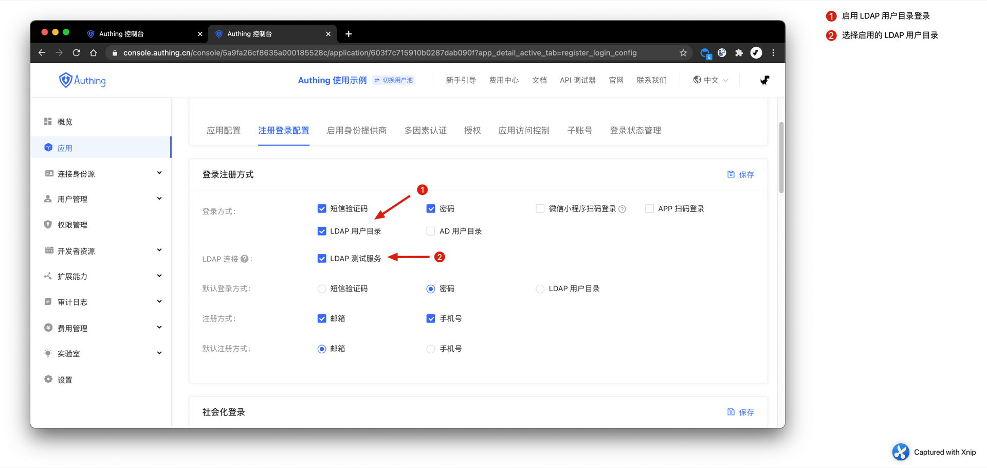 配置流程请见连接 LDAP 身份源。配置完成之后,你需要在应用中开启此登录方式: