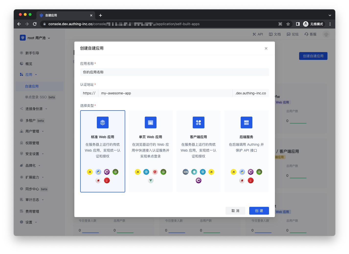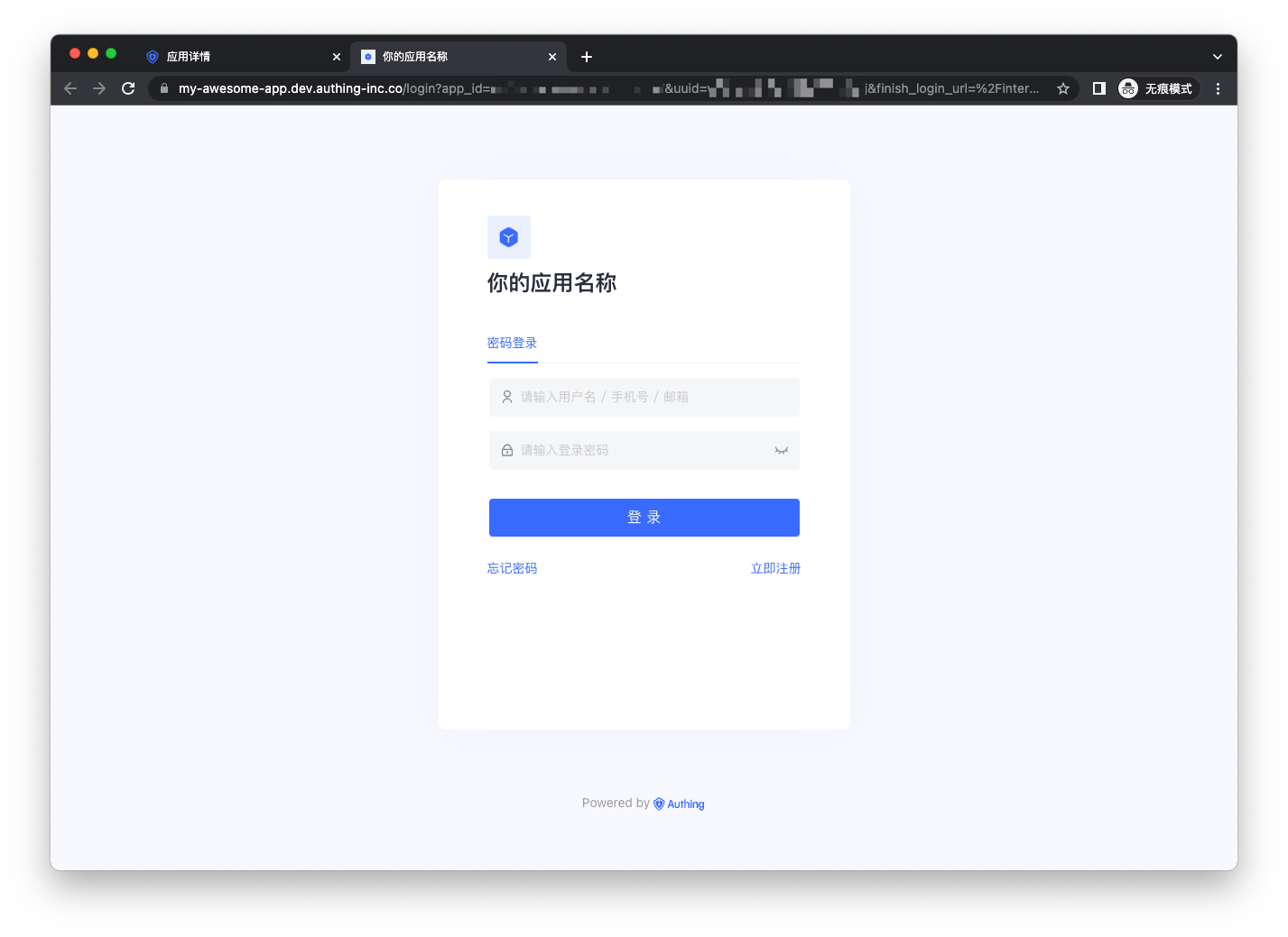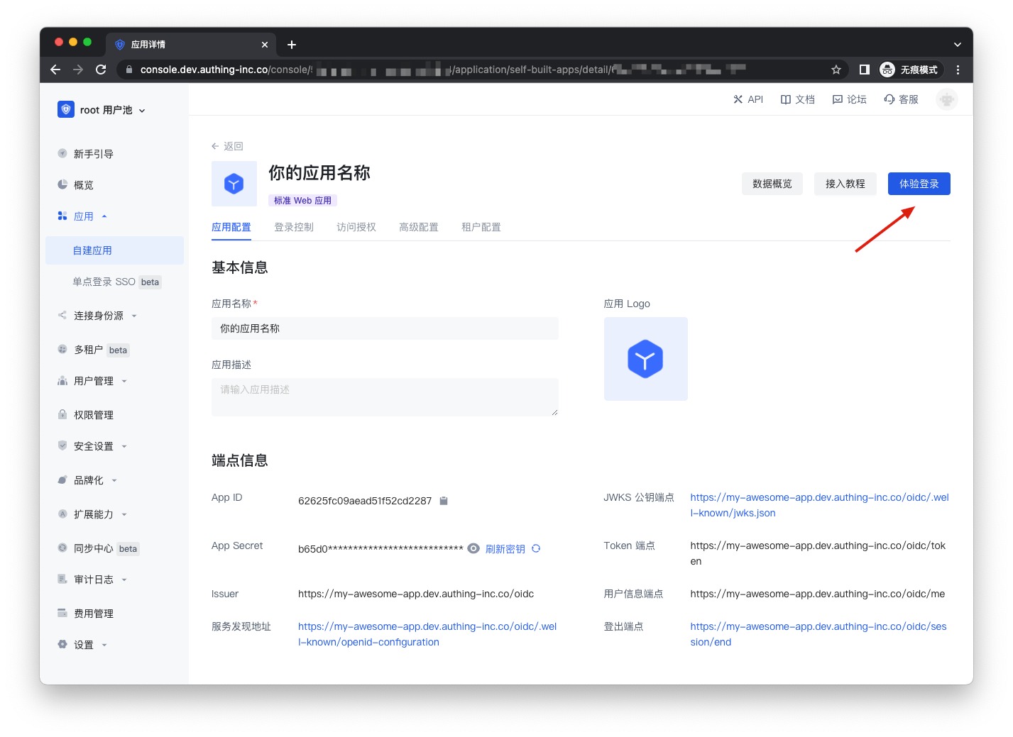 创建好应用之后,你可以点击体验登录按钮访问该应用的在线登录表单: