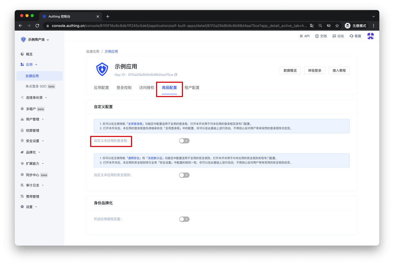 首先,找到「高级配置」区域,并打开「自定义本应用的登录框」开关。打开本开关后,本应用的登录框首先将继承你在「全局登录框」中的配置,你可以在此基础上进行改动,不用担心会对用户带来突然的登录框样式改变。