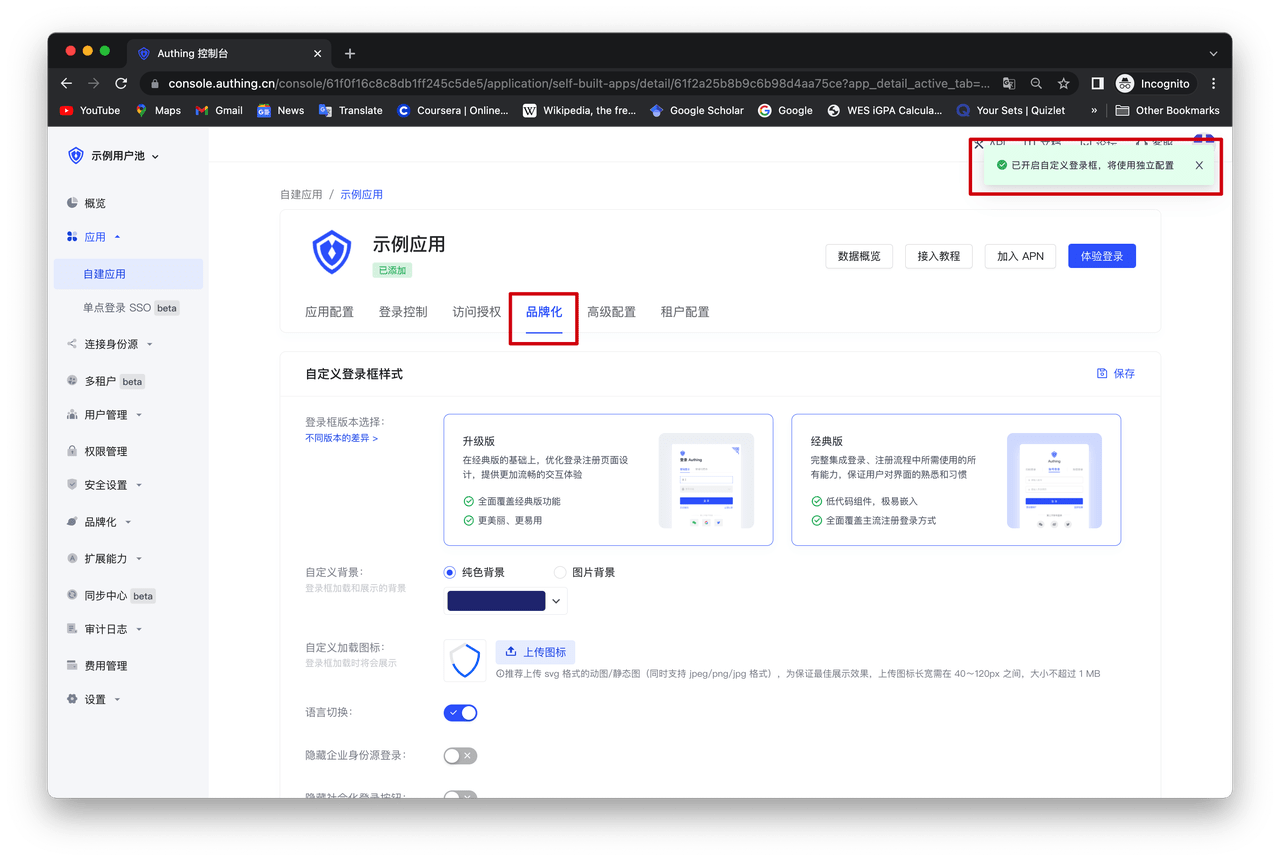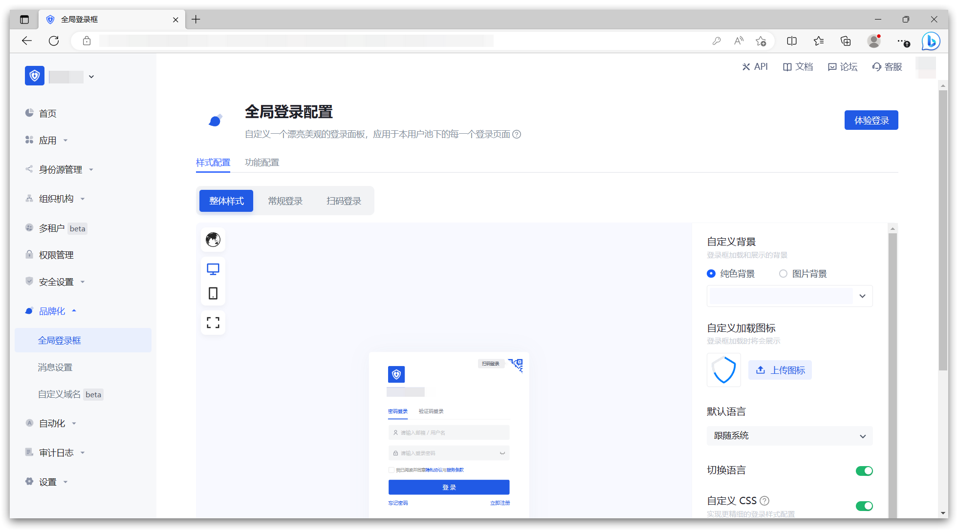 你可以在 Authing 控制台的「品牌化」功能区对整个用户池的登录框进行个性化的配置,包括「单点登录 SSO」的登录框以及用户池内所有自建应用的登录框。