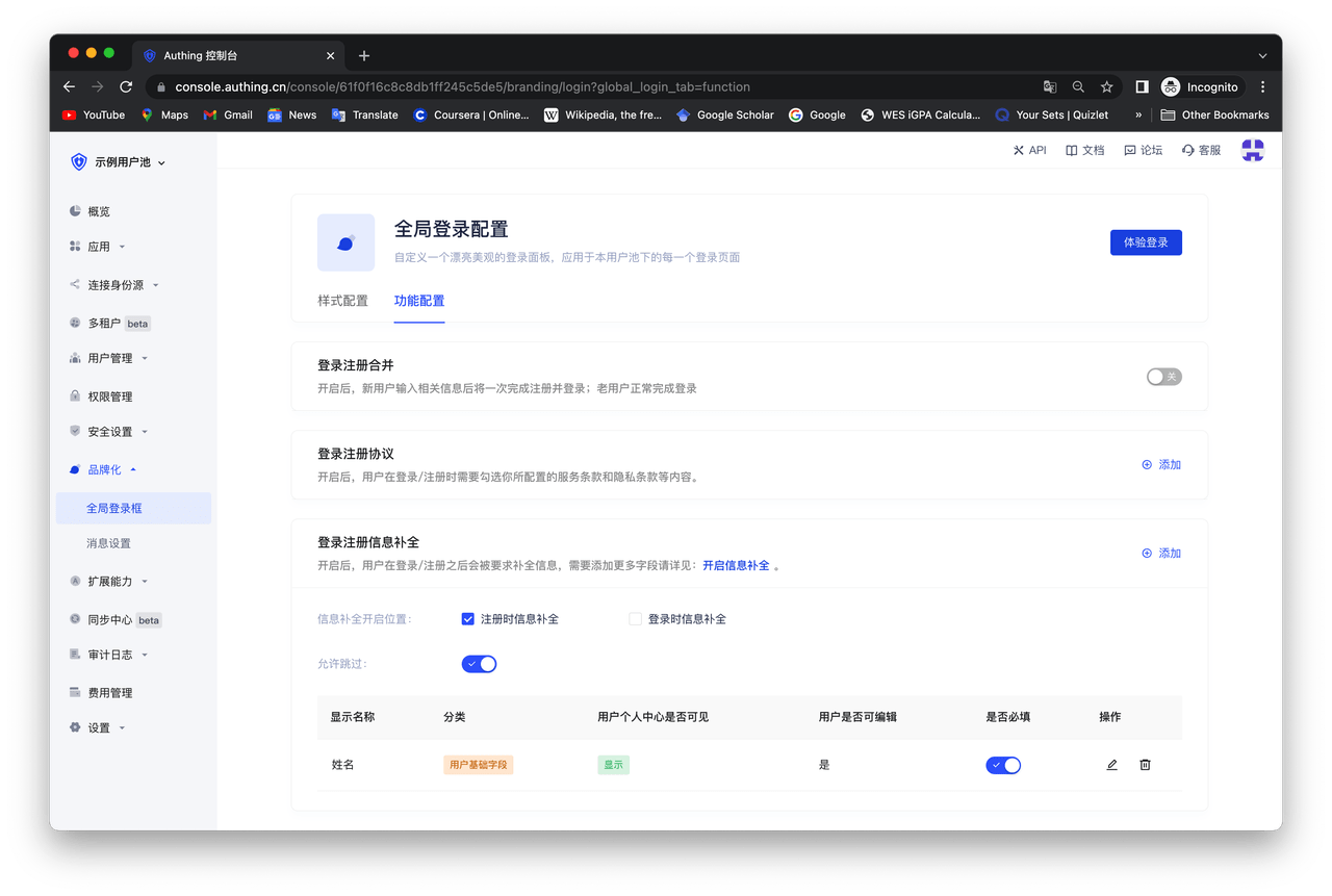 - 登录注册信息补全:开启后,用户在登录/注册之后会被要求补全信息,需要添加更多字段请详见:添加自定义用户字段 。
