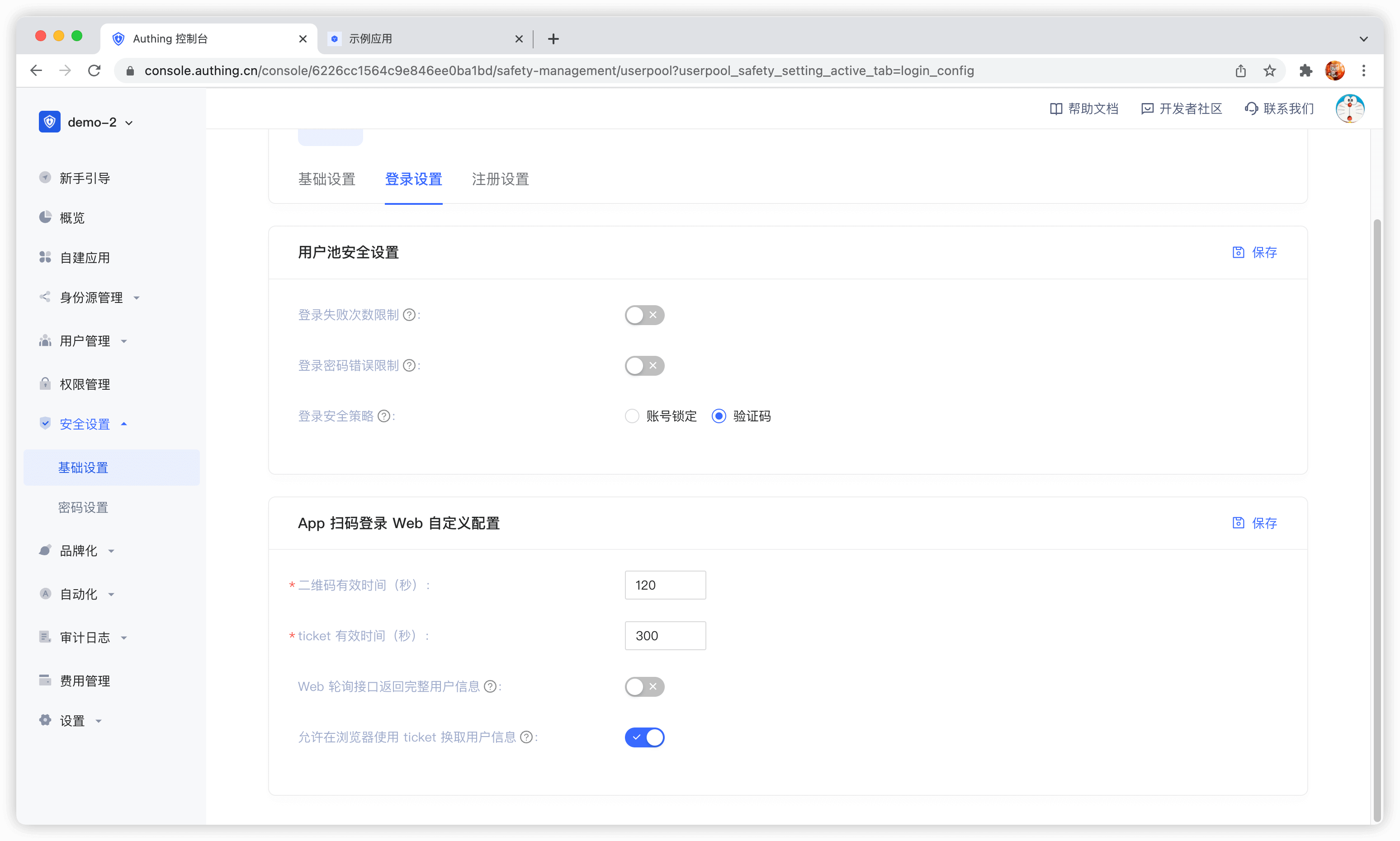 Authing 一直以来都致力于带给开发者高度自定义的开发体验,所以我们提供以下自定义配置项,开发者可以根据自己业务的需要,在安全性和便捷性之间权衡。开发者可在 Authing 控制台 (opens new window) 安全设置 -> 基础设置 -> 登录设置 -> App 扫码登录 Web 自定义配置 处自定义配置。